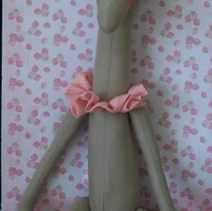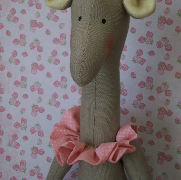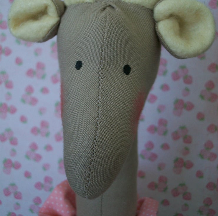 SHE IS CREATED FROM MID BEIGE FABRIC WITH LIGHT BEIGE HORNS AND INNER EARS.