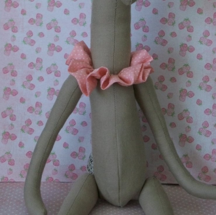 AROUND HER NECK IS A CHARMING PINK RUFFLE WITH SMALL WHITE POKA DOTS.
