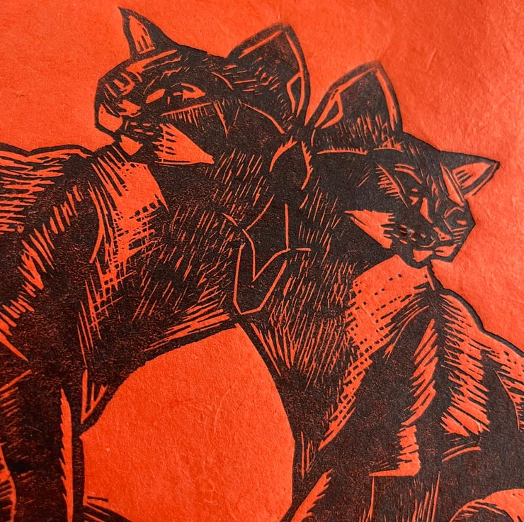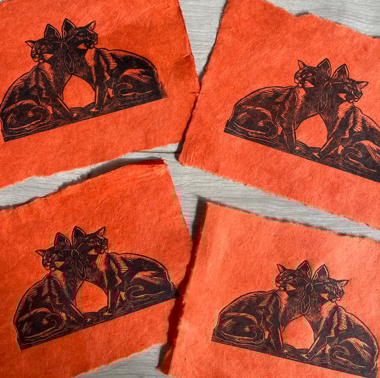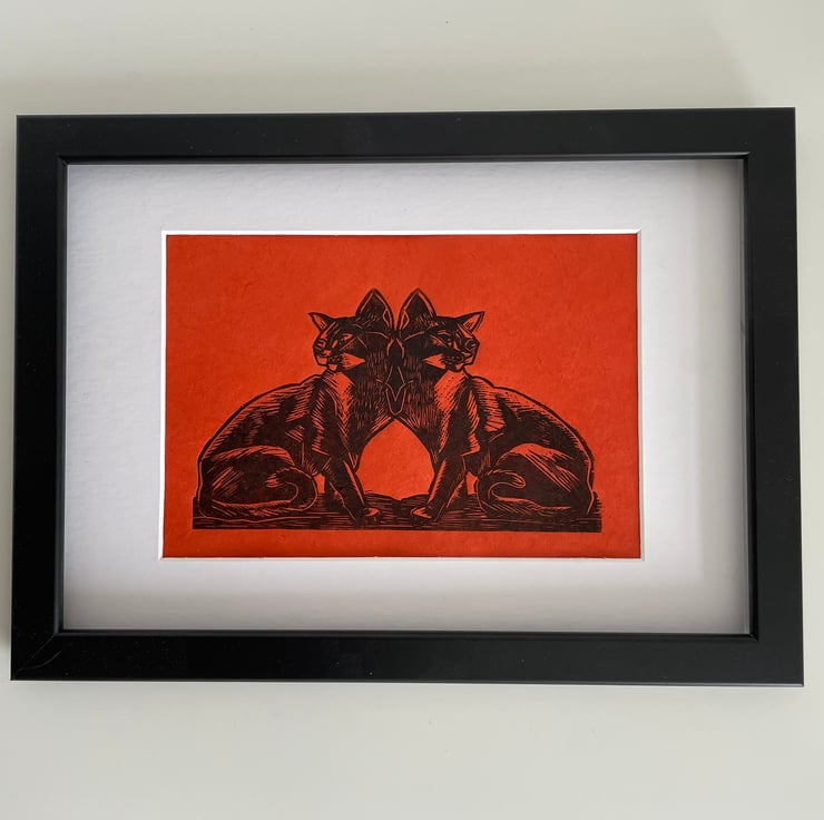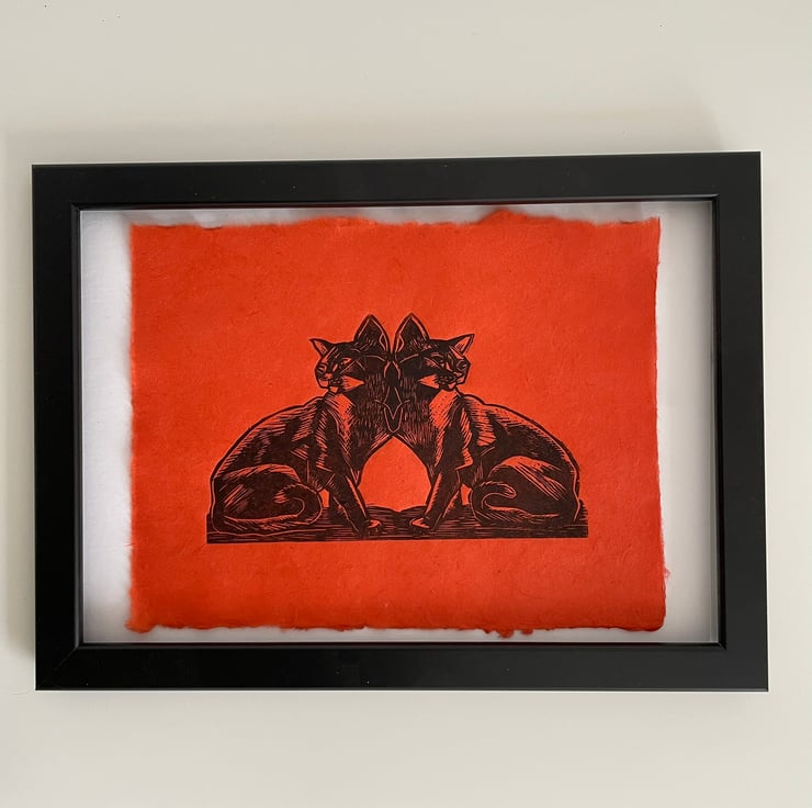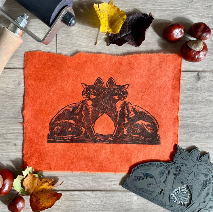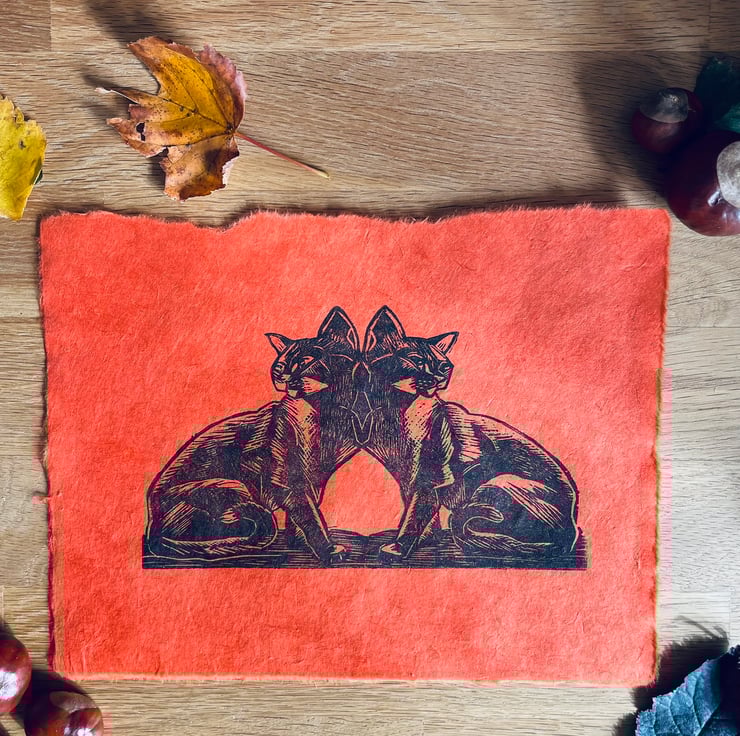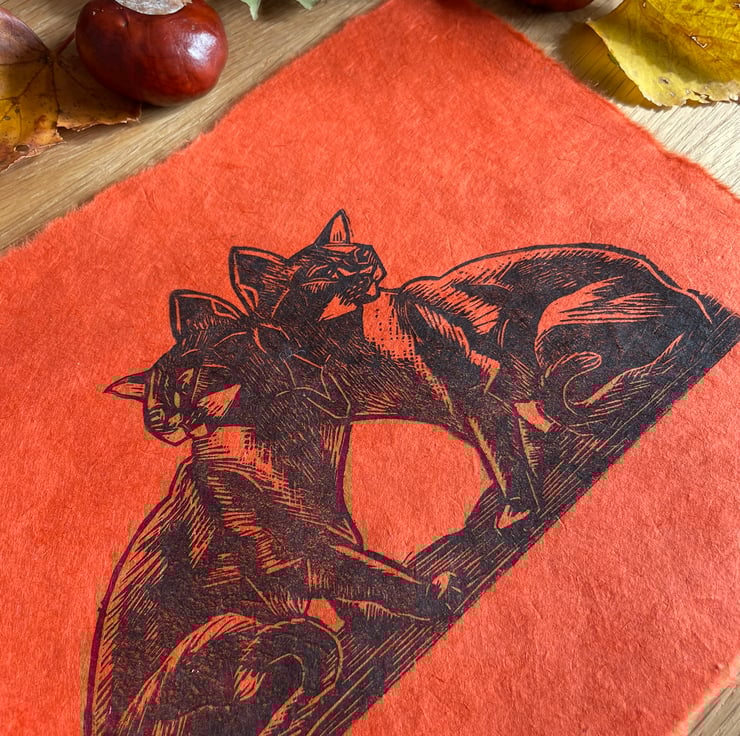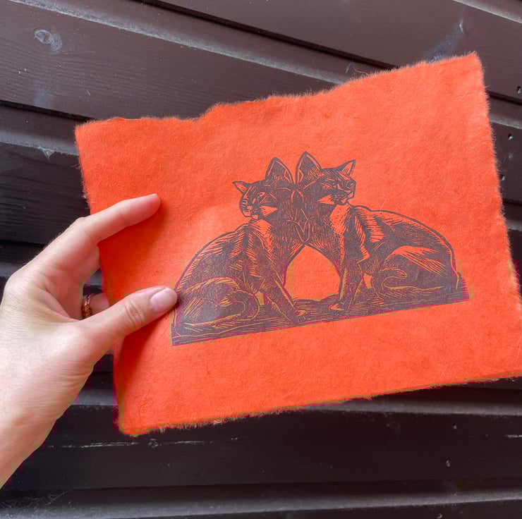 The print has been made using Caligo Safe Wash ink (Black) and Lokta paper in a shade described as Coral (similar to dark orange) with a ragged edge. The print is approx 240 x 190mm. The print is NOT framed.