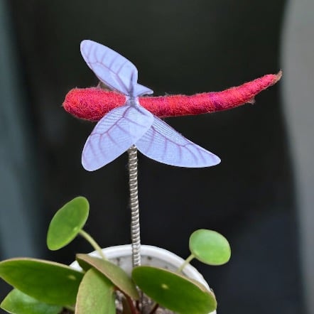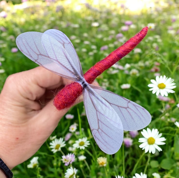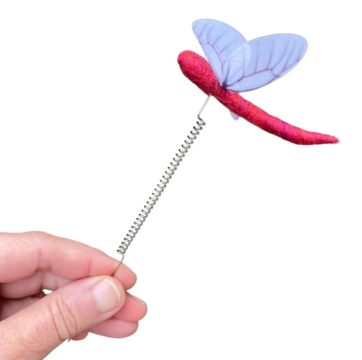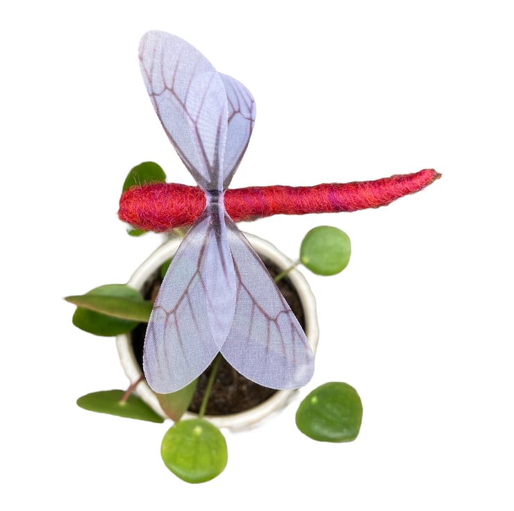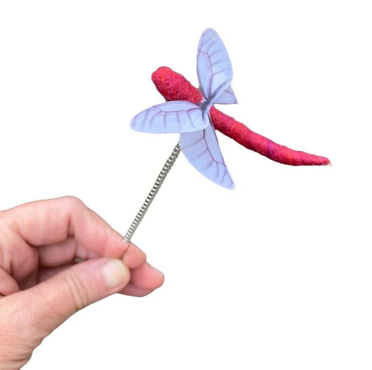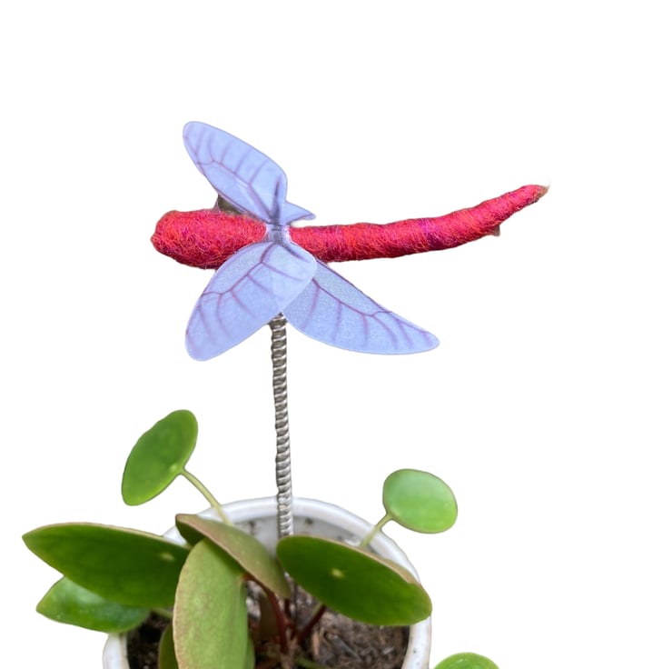 Bring a touch of nature into your home with this needle felted dragonfly plant stake. This listing is for a red dragonfly with other colours available in my shop. Each dragonfly is needle felted from woollen fibres over a wire former using a barbed felting needle to bind the fibres together. It can be gently posed. Delicate pre-formed wings have been added and the dragonfly mounted on a flexible compression spring wire stake ready to be inserted into your plant pot.