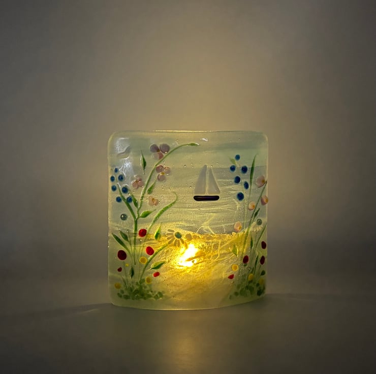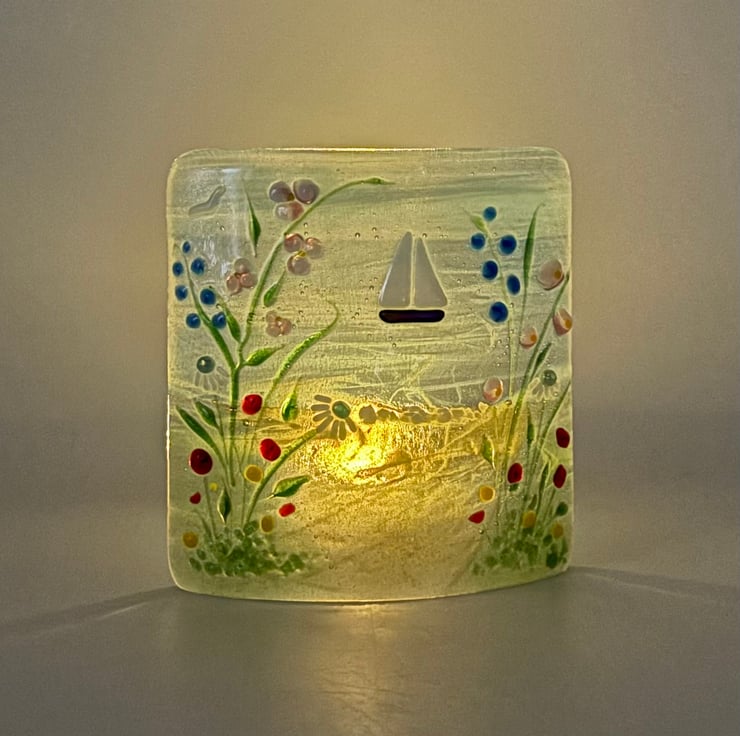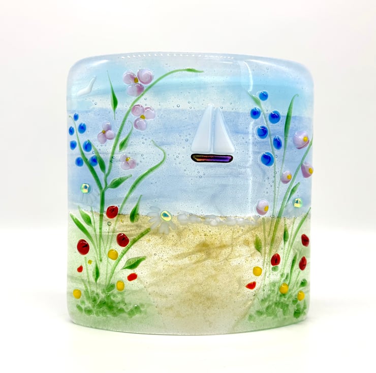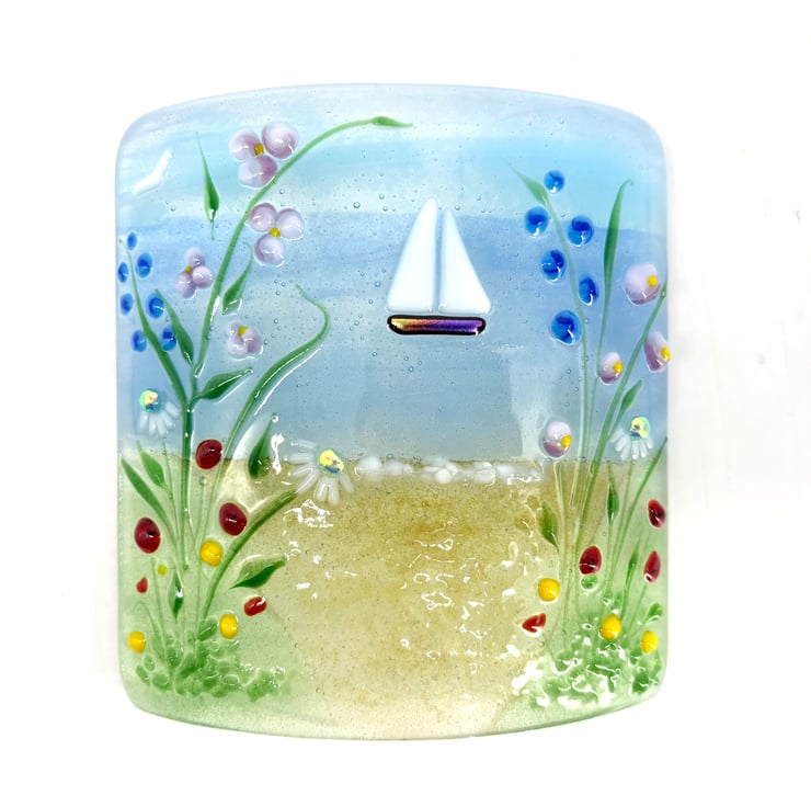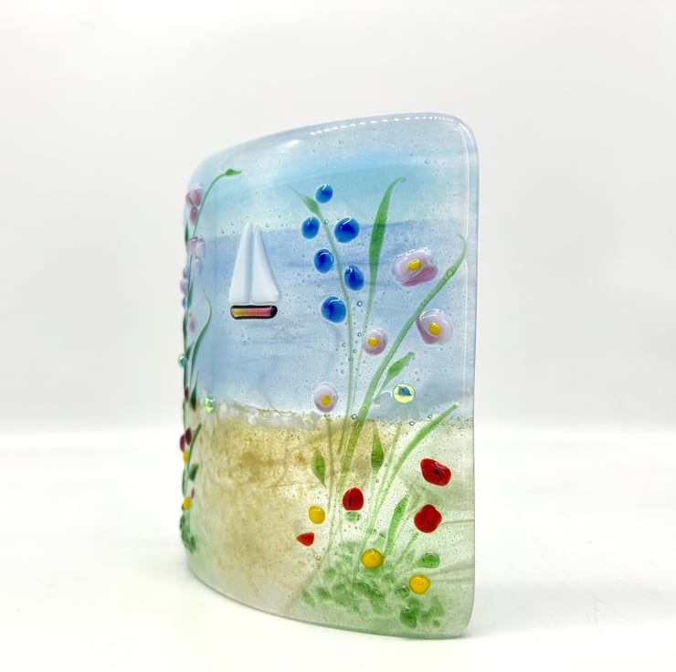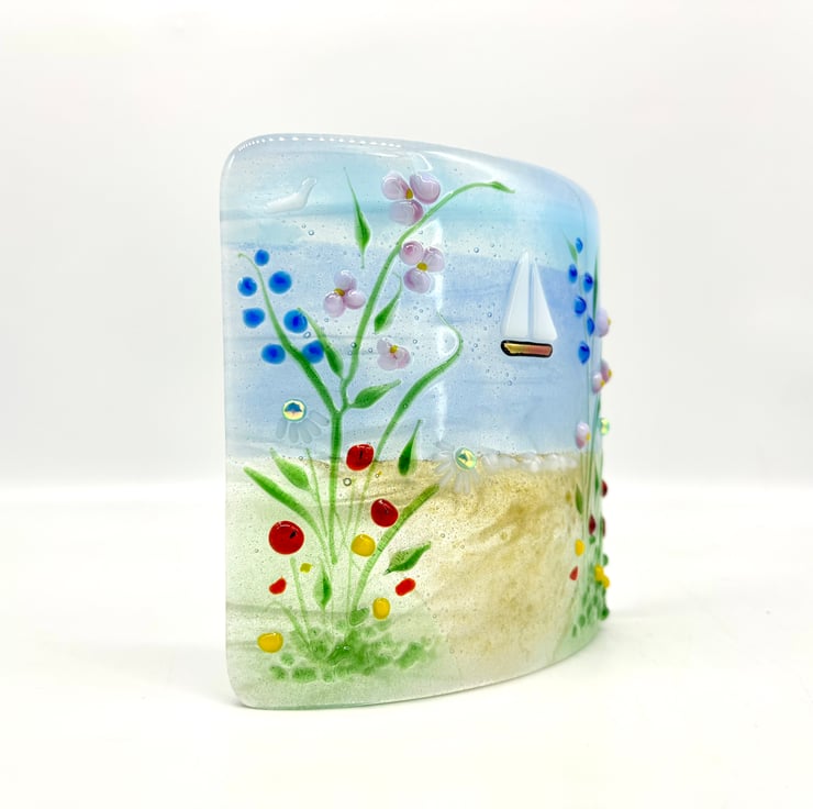 A gorgeous free standing glass curve featuring a coastal scene with delicate flowers a sailing boat.