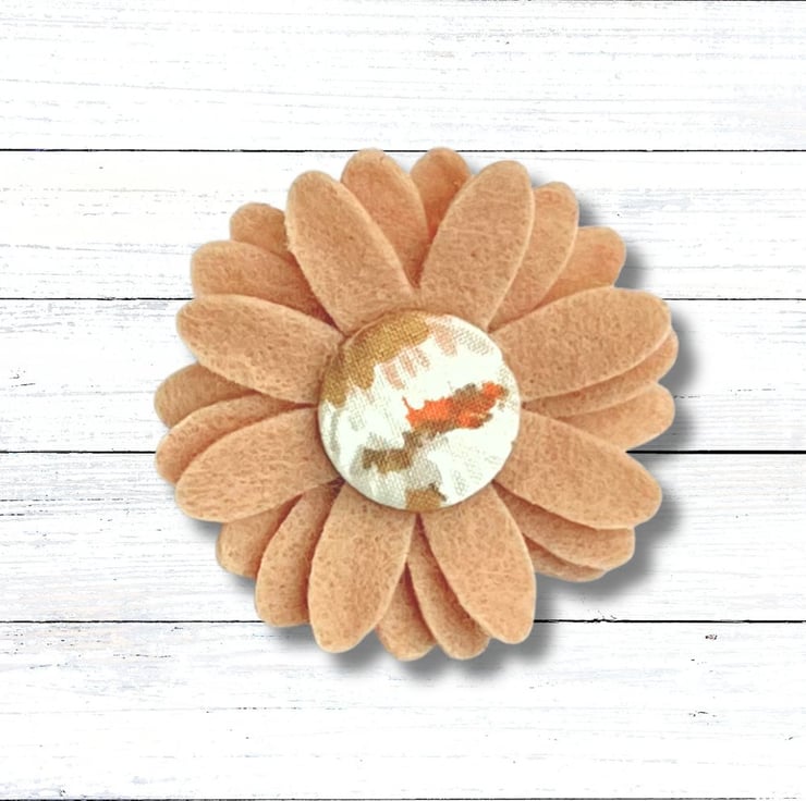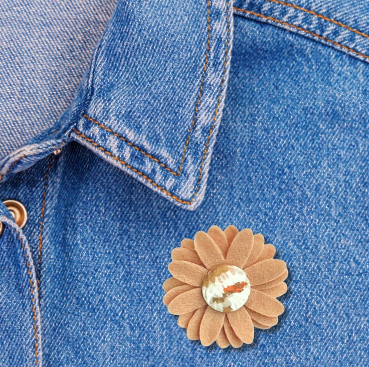 Add a pop of colour to any outfit with this beautiful felt flower brooch, hand-crafted from felt and patterned fabric self-covered buttons.