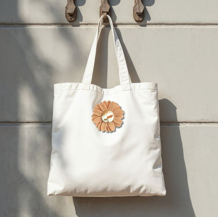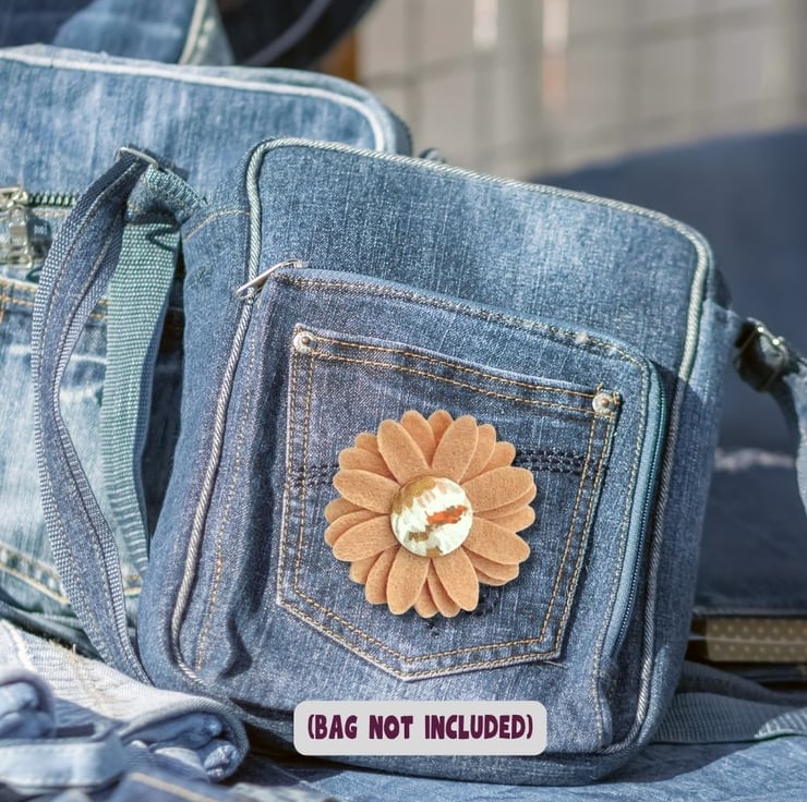 The flower measures approximately 6cm in diameter – the perfect size to brighten up a coat lapel, cardigan, scarf, or bag. At its heart sits a unique fabric-covered button, handcrafted from leftover fabrics.