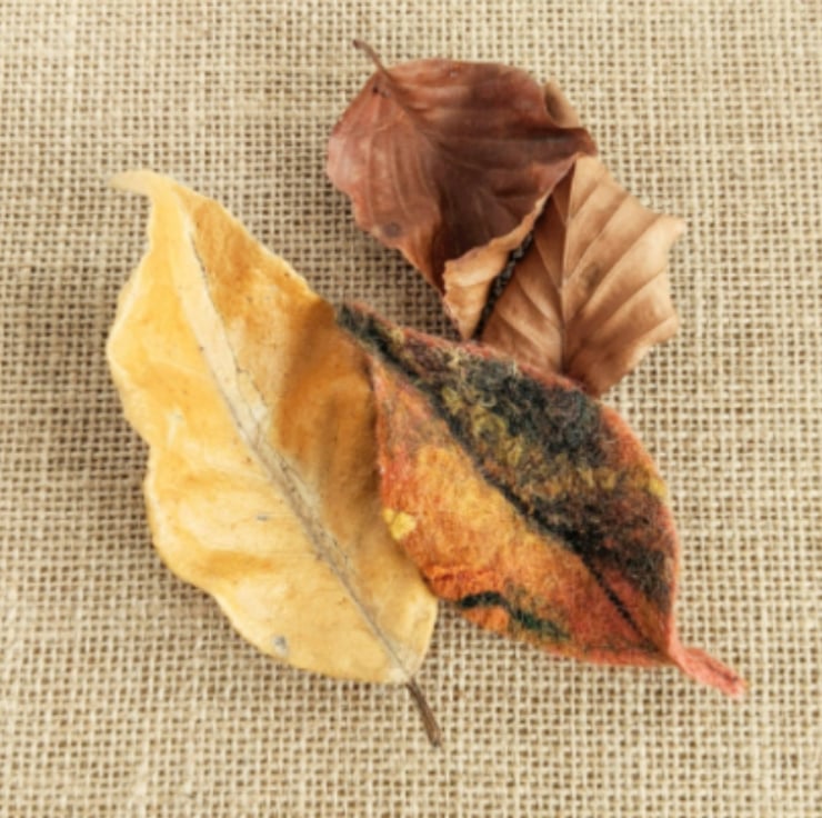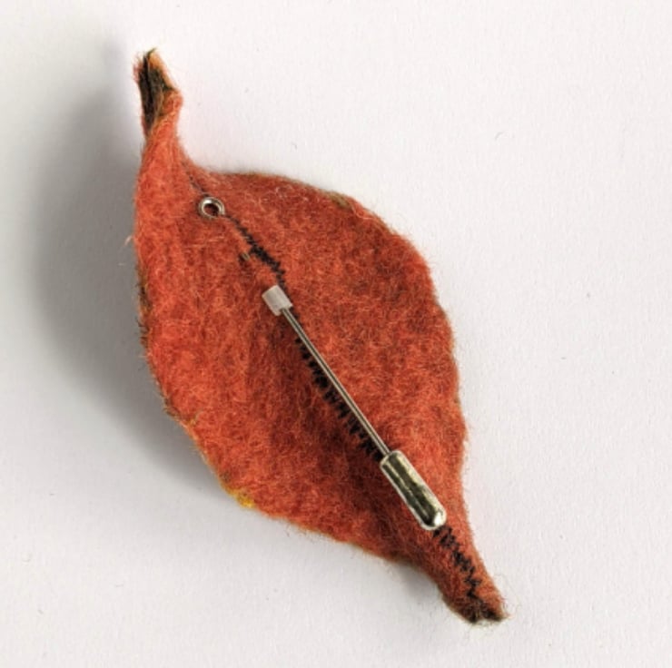 Felted leaf brooch handmade from soft merino wool in rich shades of rust and orange. It is embellished with silk ribbon and bamboo threads for subtle texture and shine, then lightly stiffened so that it retains its sculptural qualities.