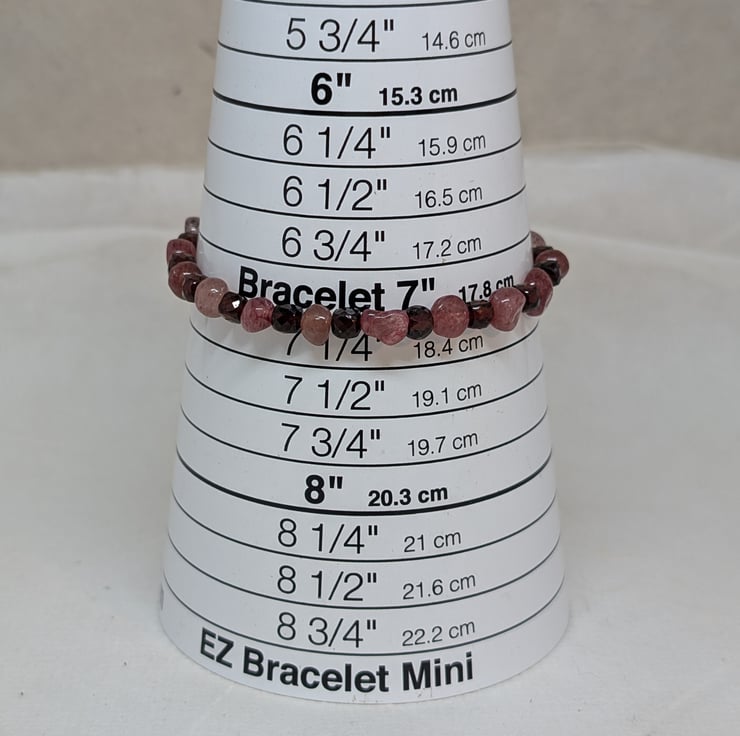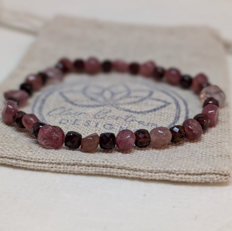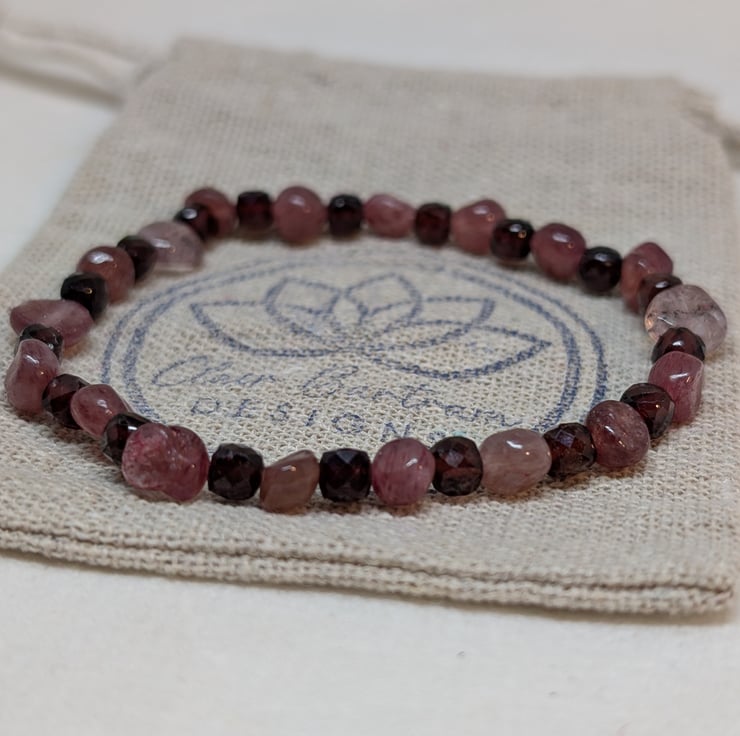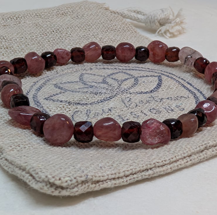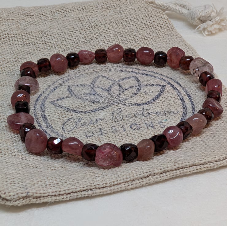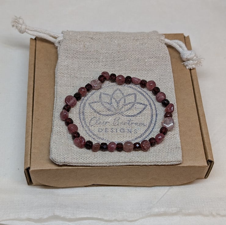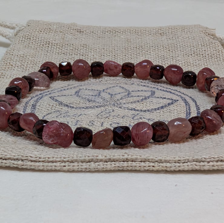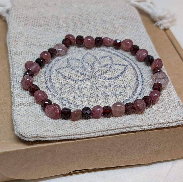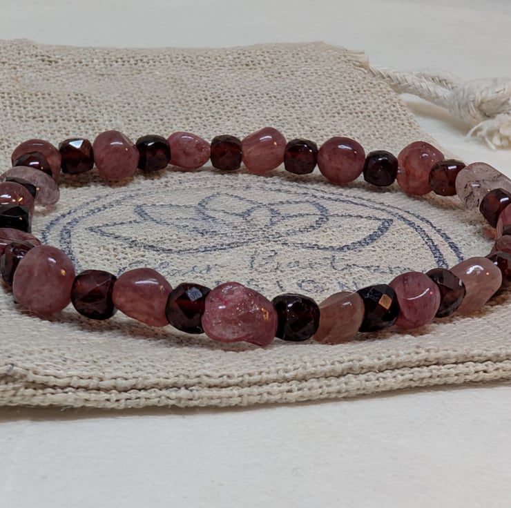 This bracelet combines the soft pink tones of strawberry quartz nuggets with deep burgundy faceted garnet cubes, bringing together two gemstones that glow beautifully in the light. It’s strung on strong stretch cord for an easy, comfortable fit.