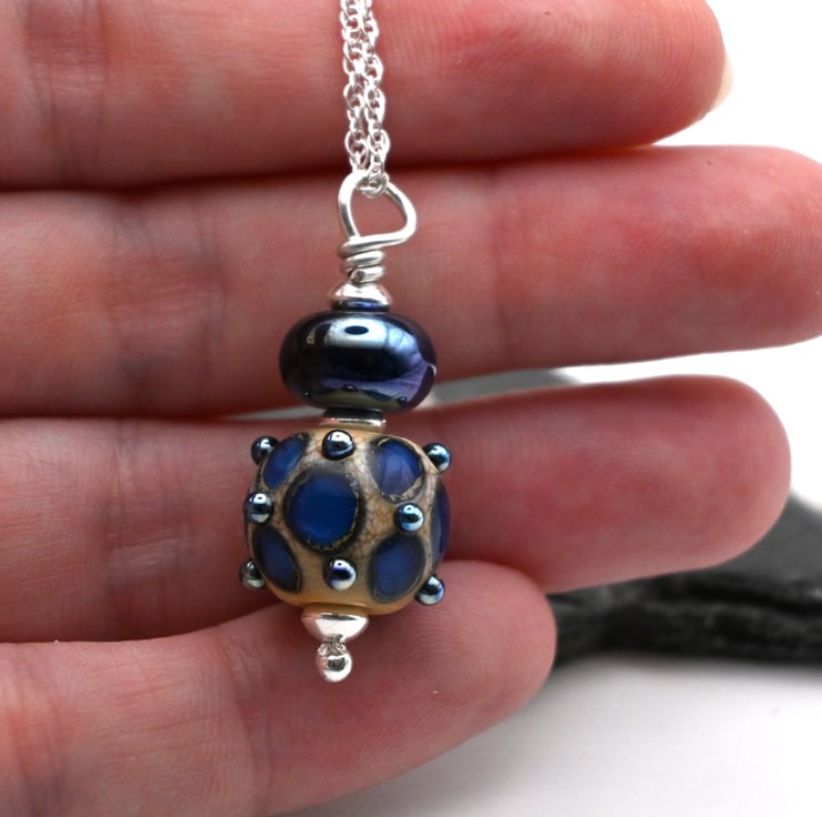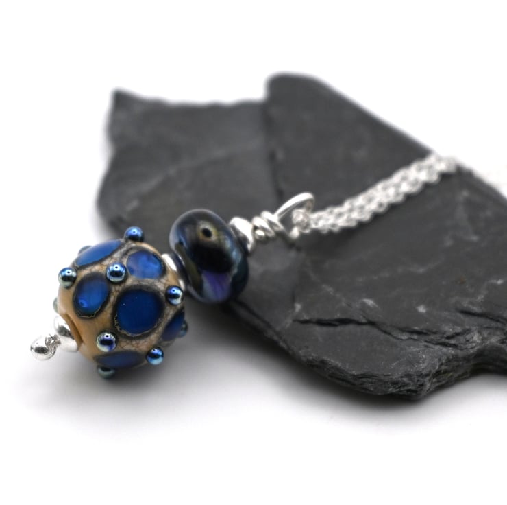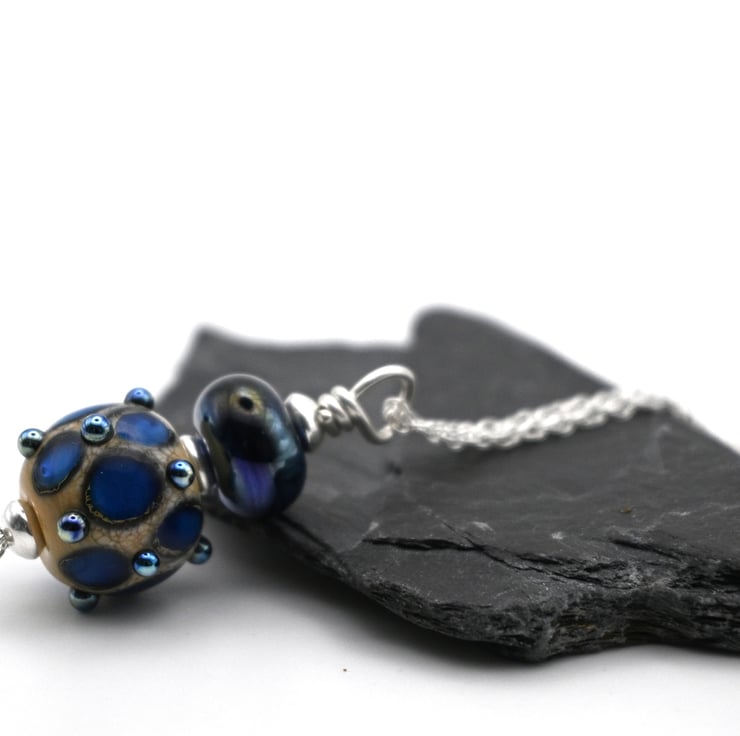 A sterling silver chain which features a handmade lampwork glass pendant.