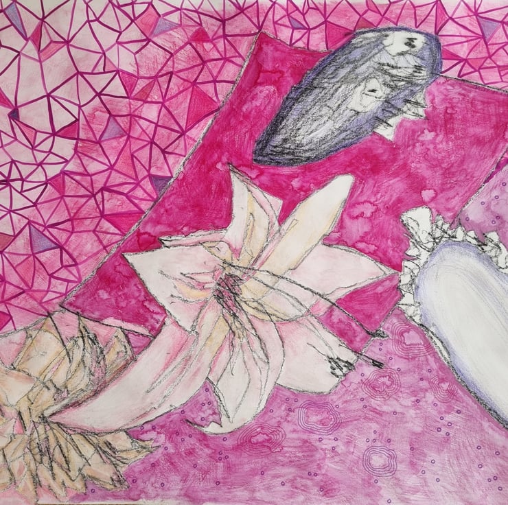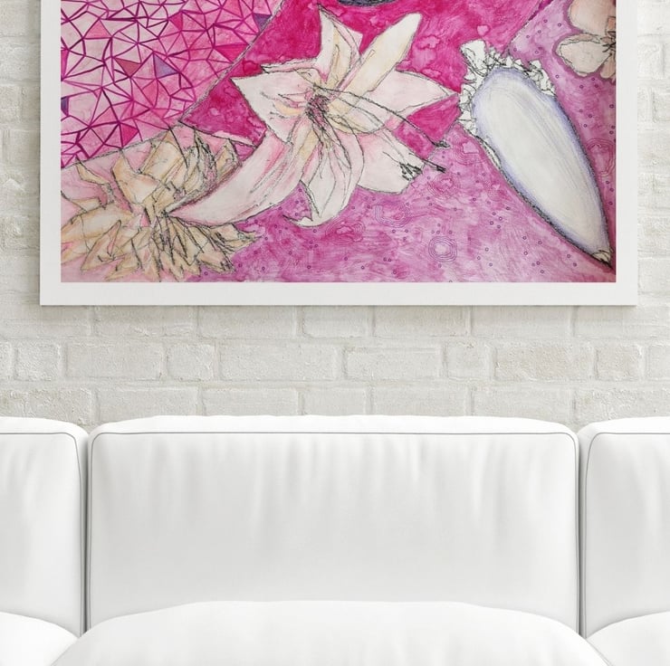 Created using mixed media on paper, this original work explores feminine energy and the poetry of nature through texture and colour.