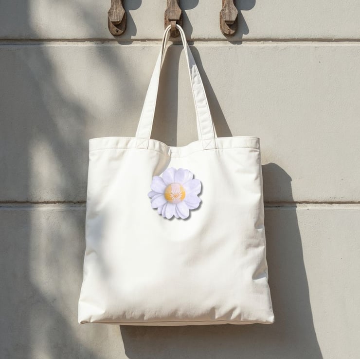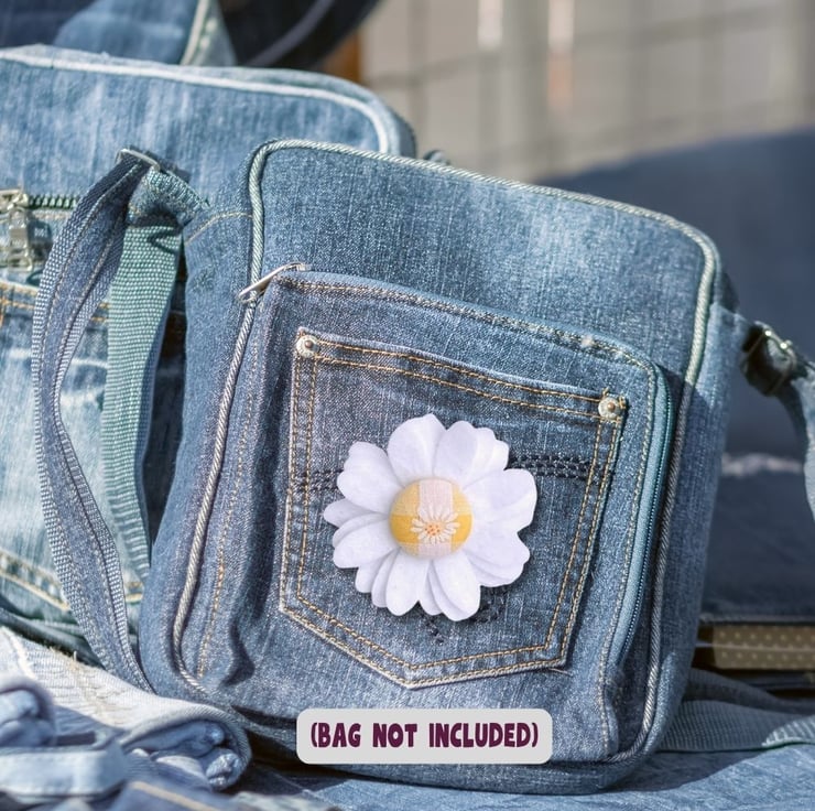 The flower measures approximately 6cm in diameter – the perfect size to brighten up a coat lapel, cardigan, scarf, or bag. At its heart sits a unique fabric-covered button, handcrafted from leftover fabrics.