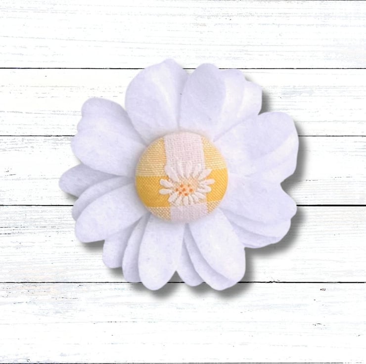 Add a pop of colour to any outfit with this beautiful felt flower brooch, hand-crafted from felt and patterned fabric self-covered buttons.