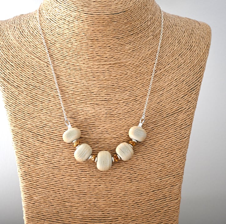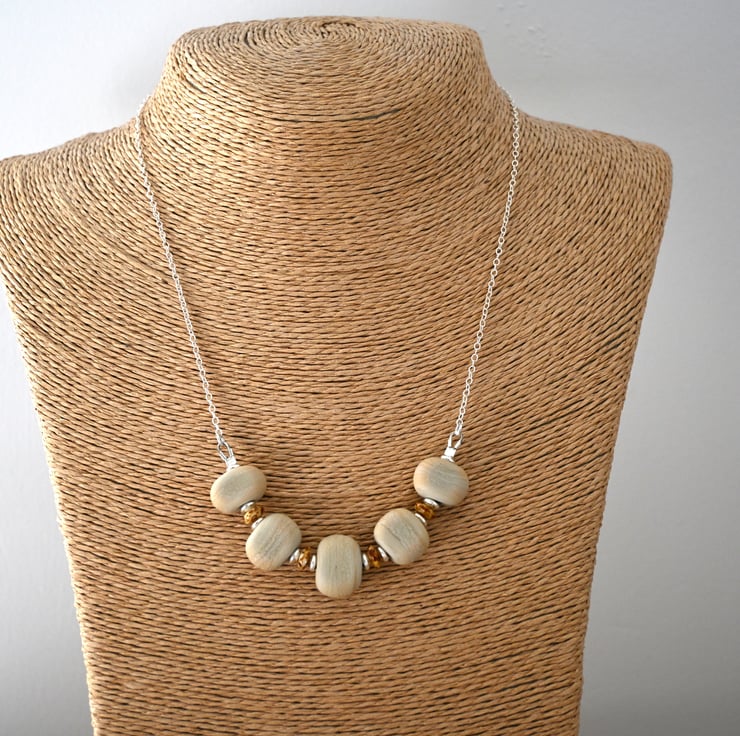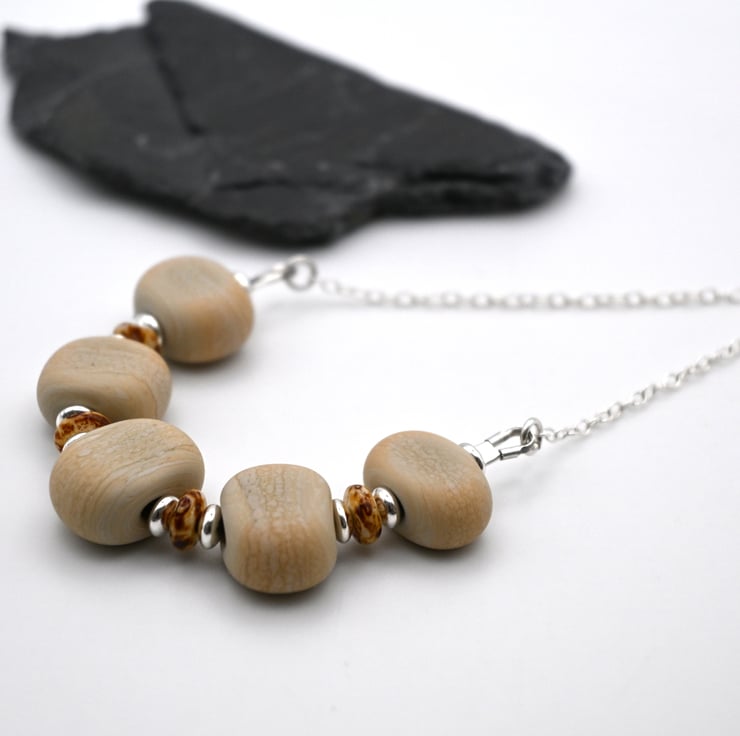 A necklace which features sterling silver chain and handmade lampwork glass beads.