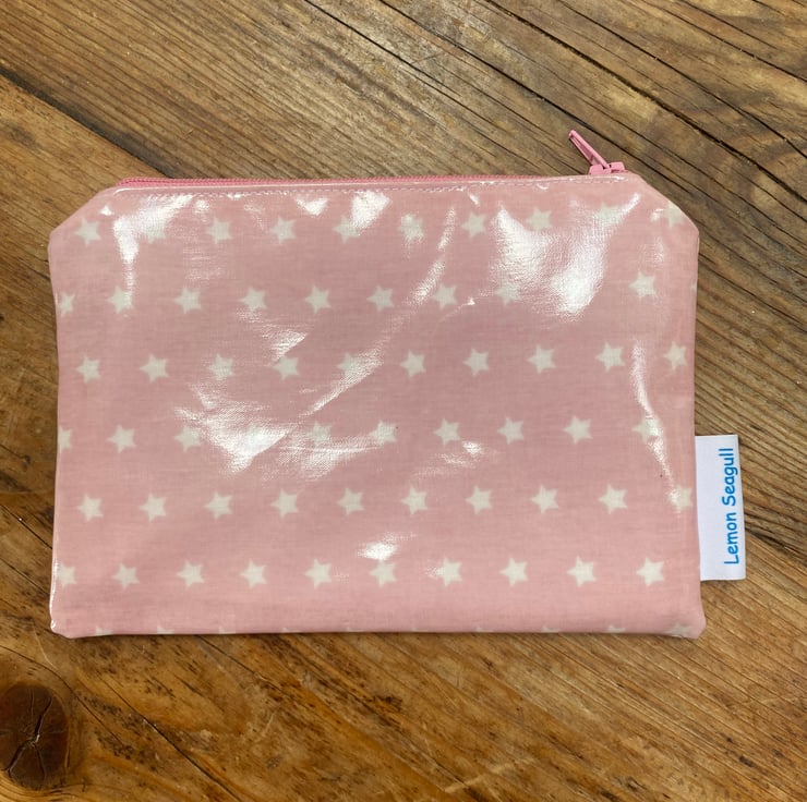 This make up bag is made from a pink oil cloth with white stars. The bag is lined with white cotton fabric and a pink zip.