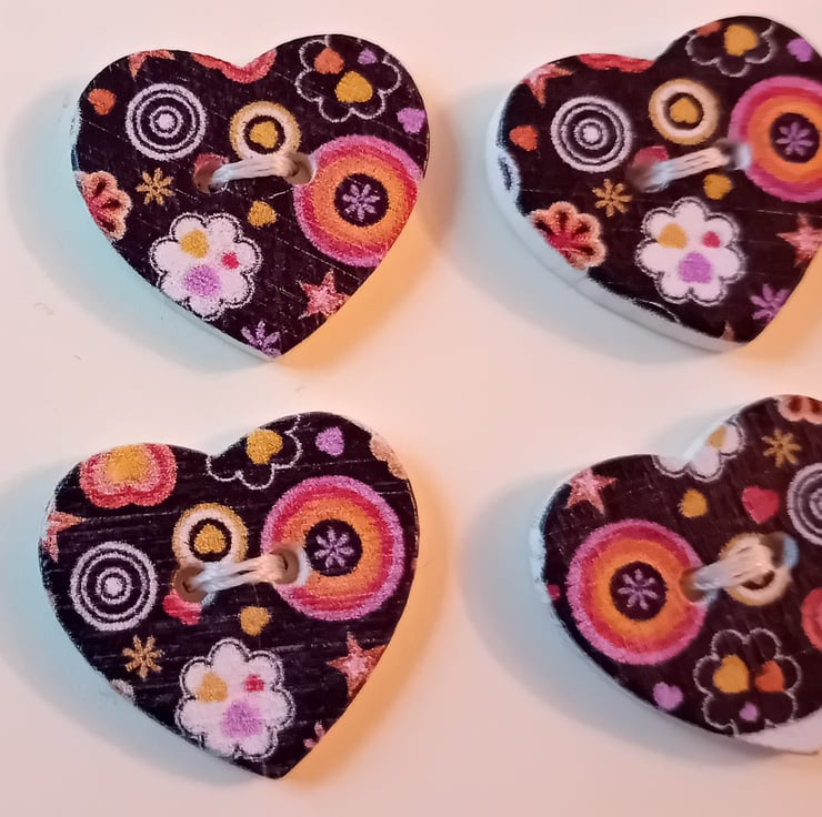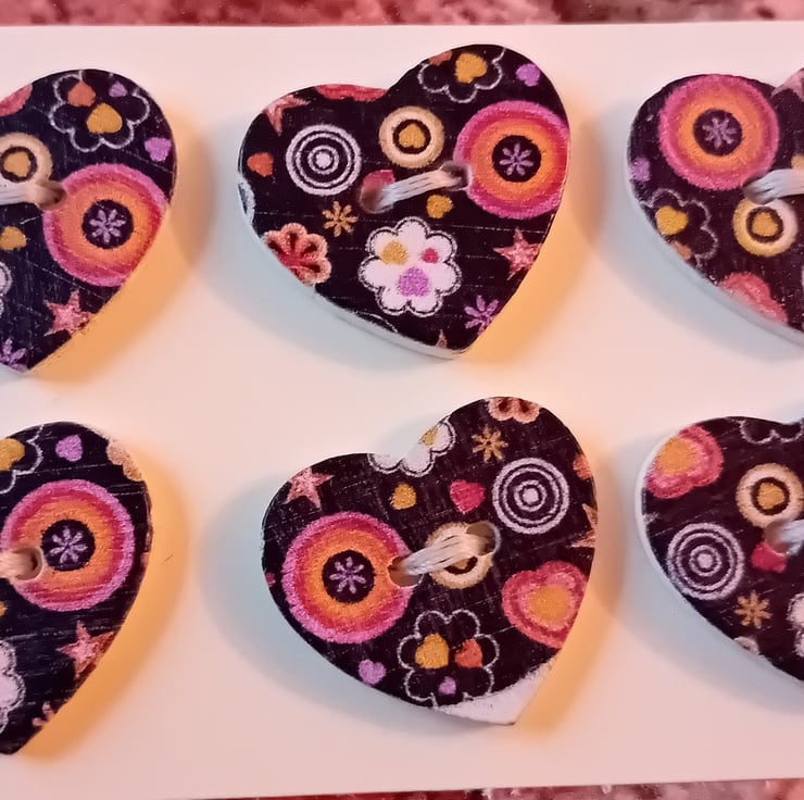 A little bundle of six heart-shaped buttons with a bold retro 1970s style design. Each button has two holes, ready to jazz up your next craft, sewing, or upcycling project.