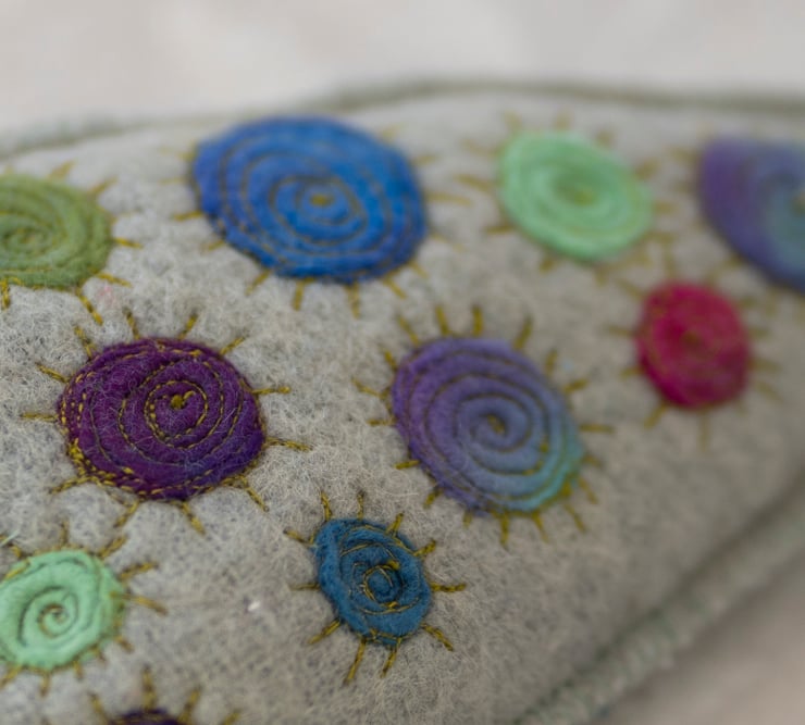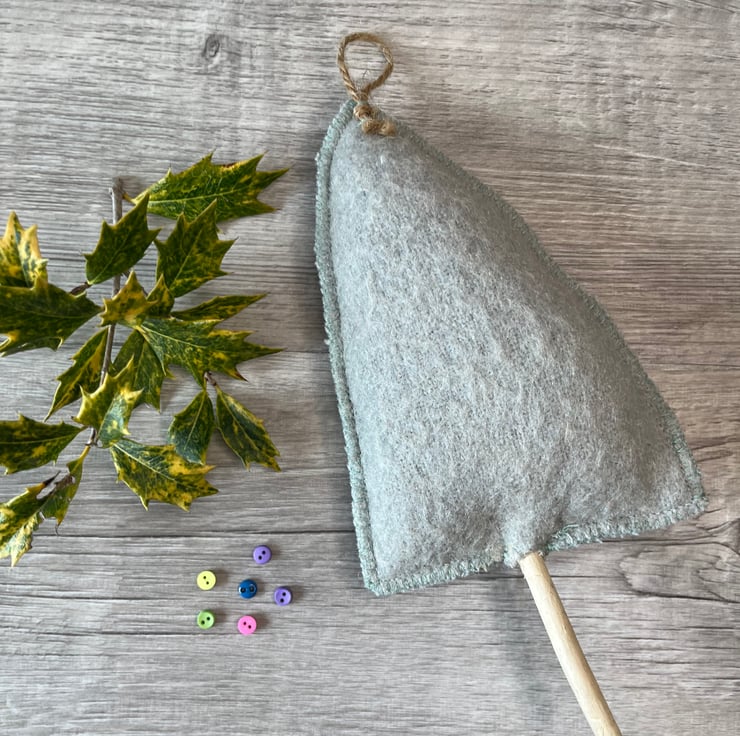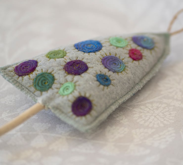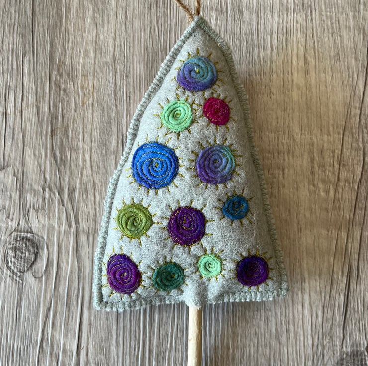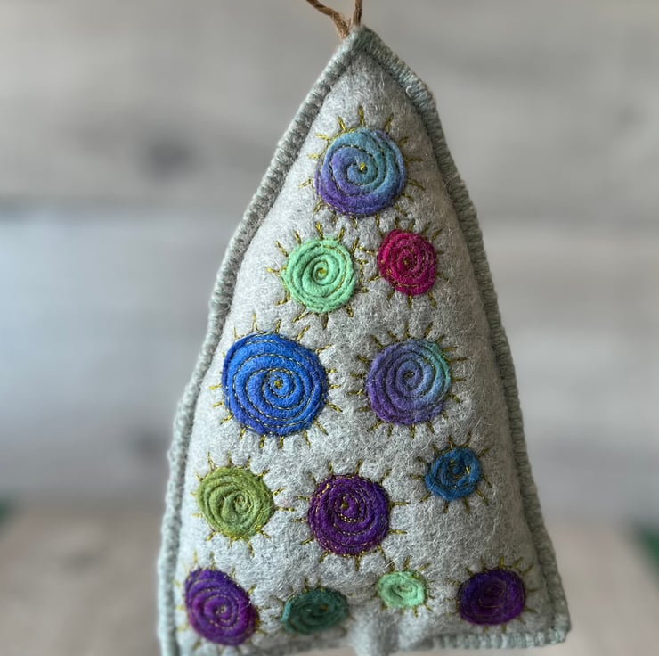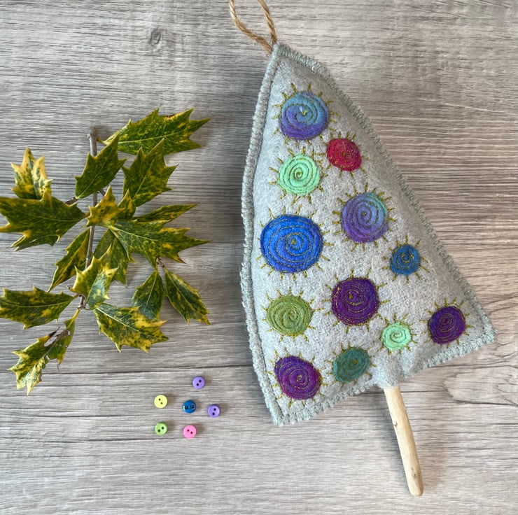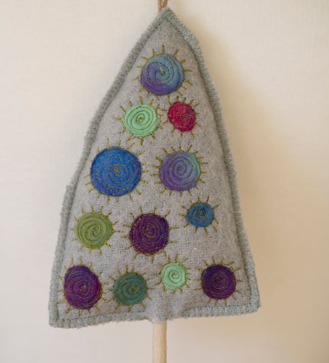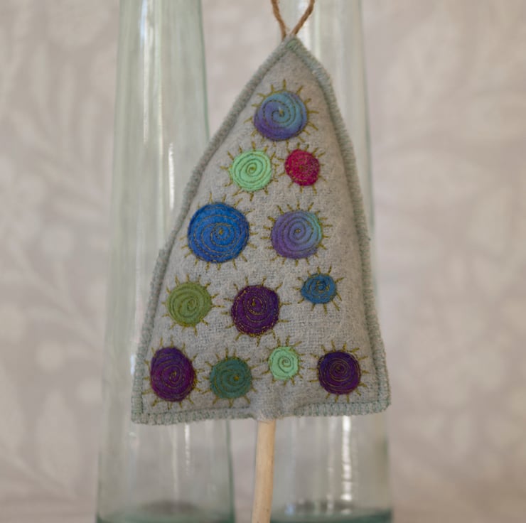 This little tree is made from a repurposed wool blanket that I have felted and dyed to create something a little different. It is decorated with multicoloured dyed wool circles which have been machine embroidered. The edges are stitched with blanket stitch which echoes the original use of the fabric.