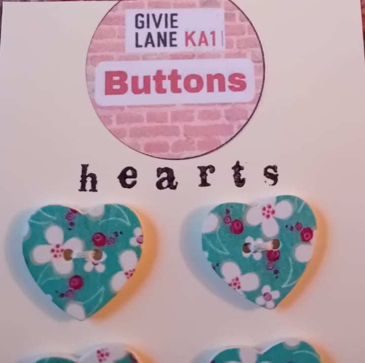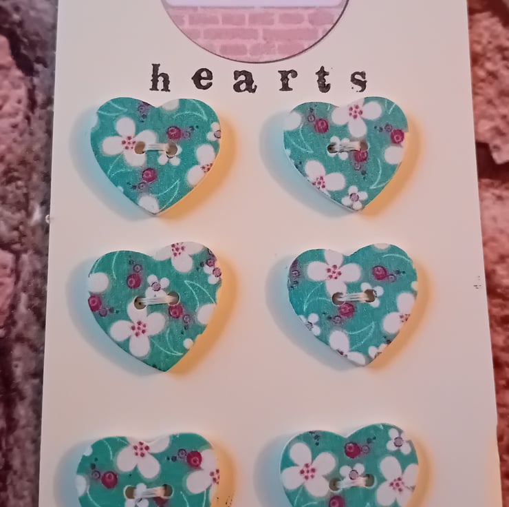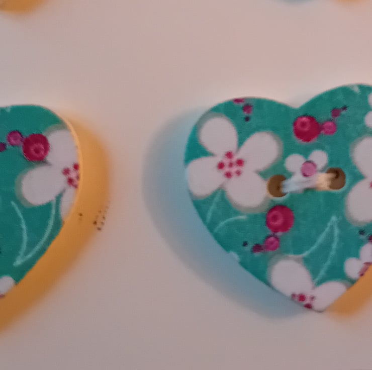 A little bundle of six heart-shaped buttons with a cheerful turquoise and pink floral design. Each button has two holes, ready to jazz up your next craft, sewing, or upcycling project.
