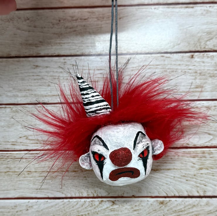 A spun cotton clown head with glass eyes and faux fur hair. This head and hat is hand painted and comes with a waxed thread hanger attached. Clown head measures roughly 7.5cm tall and 6cm wide. Sent in recyclable or recycled packaging.