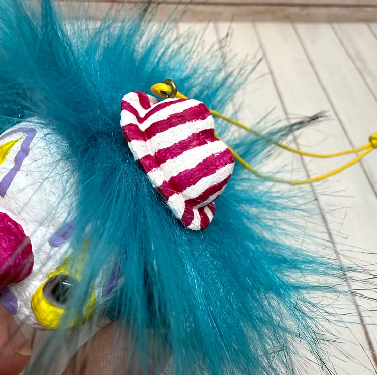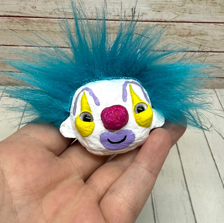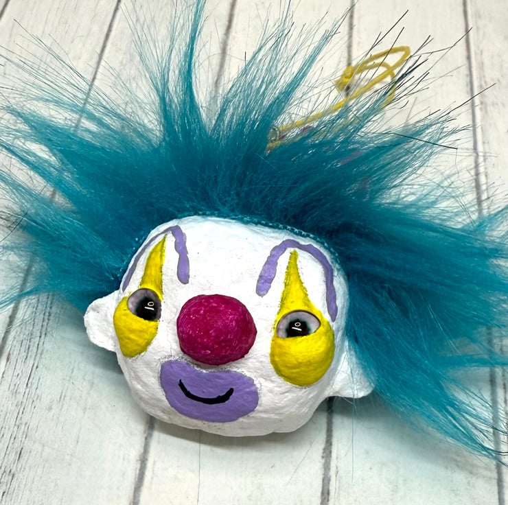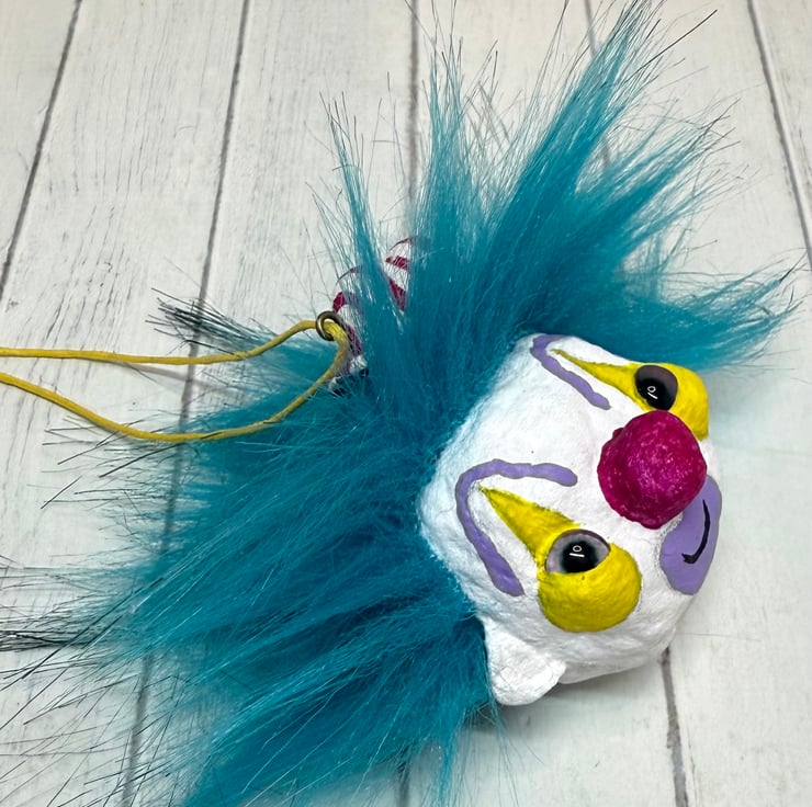 A spun cotton clown head with glass eyes and faux fur hair. This head and hat is hand painted and comes with a waxed thread hanger attached. Clown head measures roughly 5cm tall and 6cm wide. Sent in recyclable or recycled packaging.