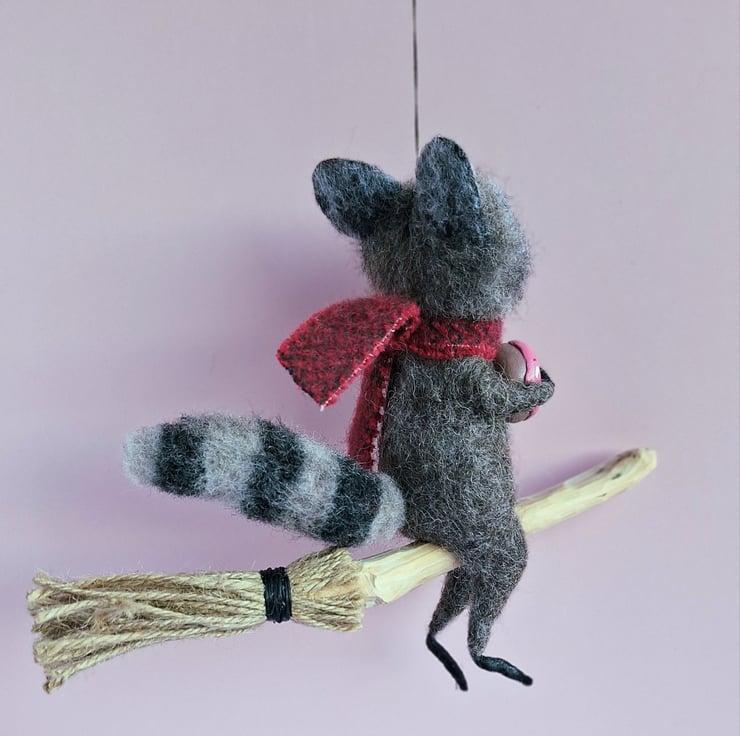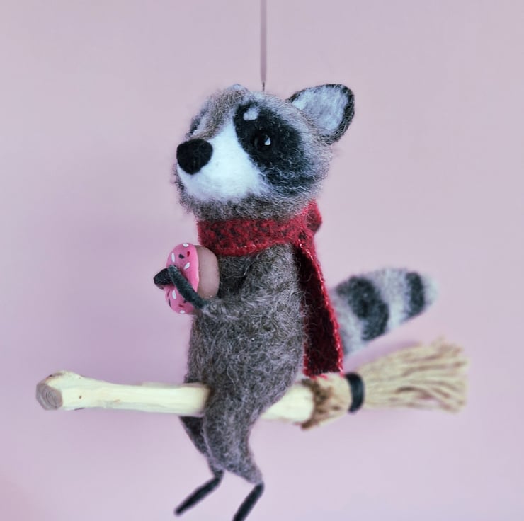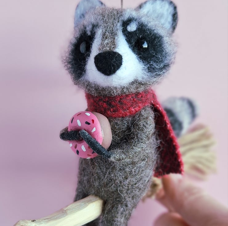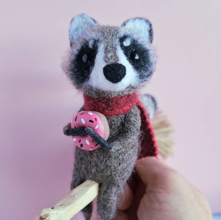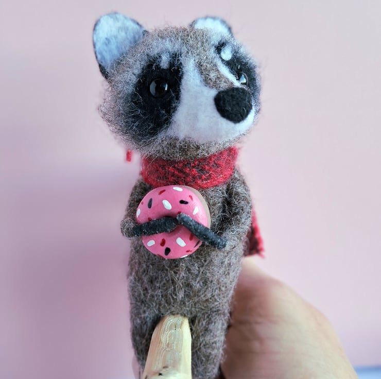 These sneaky Trash Panda's have been raiding the treat bowl! Each one is handmade from soft carded wool, and have little black glass eyes, and hand sculpted polymer clay donuts.