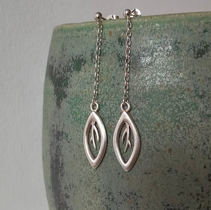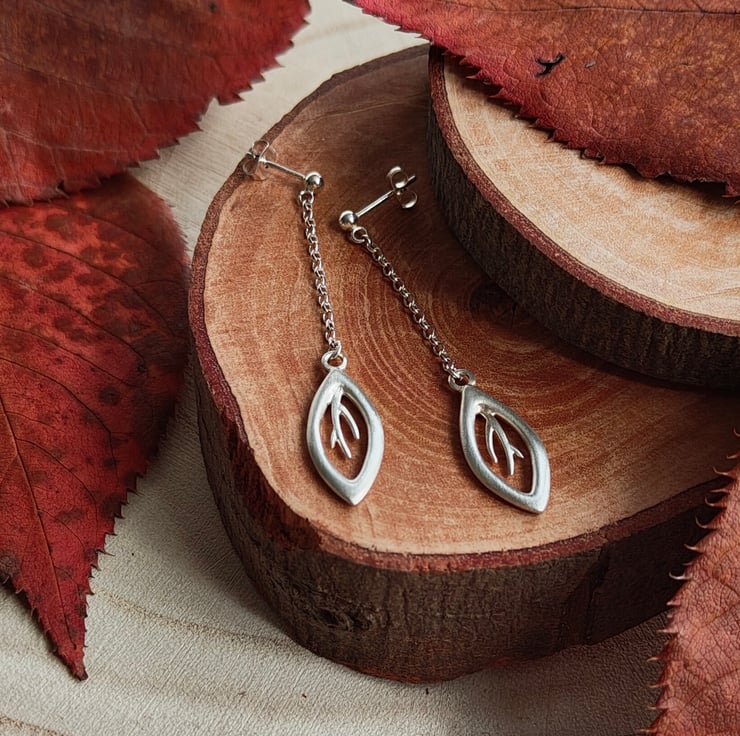 These sterling silver ‘Falling Leaves’ earrings are beautiful and elegant. A simple single leaf shape with delicate vein detail is given a brushed matt finish and hangs from a fine belchar chain, fitted to a sterling silver ball stud with scrolls. These are a stunning addition to an outfit for a special occasion. Compliment with a ‘Falling Leaves’ collection necklace to complete the look. These earrings have been hallmarked at the Birmingham Assay Office.