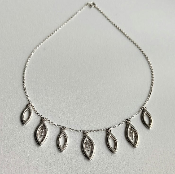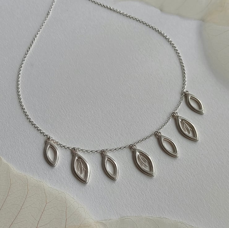 This sterling silver ‘Falling Leaves’ collection necklace is beautiful and elegant. Seven leaf shapes, 3 with delicate vein detail are given a brushed matt finish and hang from a 40cm sterling silver fine belchar chain. A stunning addition to an outfit for a special occasion, compliment with earrings from the ‘Falling Leaf’ collection. This piece has been hallmarked at the Birmingham Assay Office.