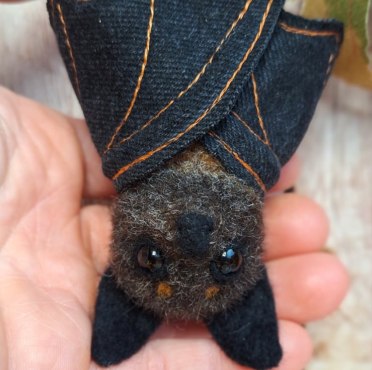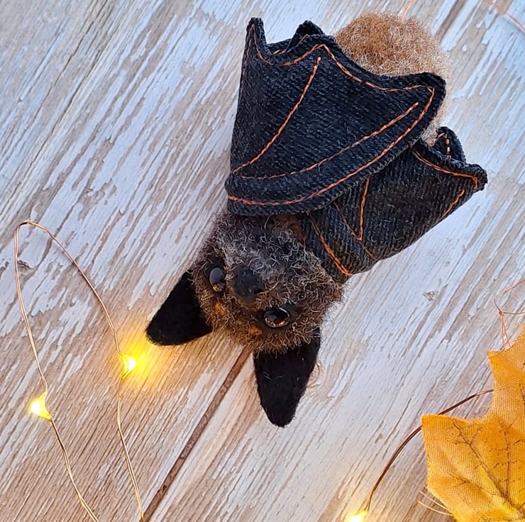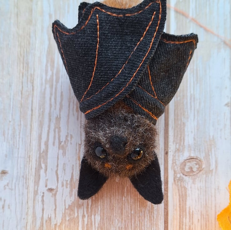 These cute feltie Bats are handcrafted from upcycled denim and soft wool. They have tiny black glass eyes, orange stitched wings reinforced with wire, and can be hung from an orange thread for display.