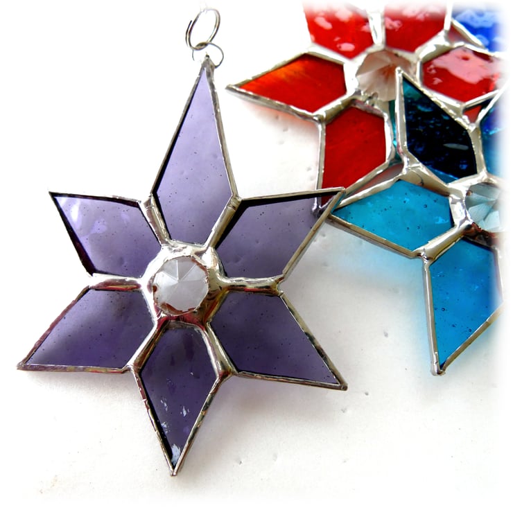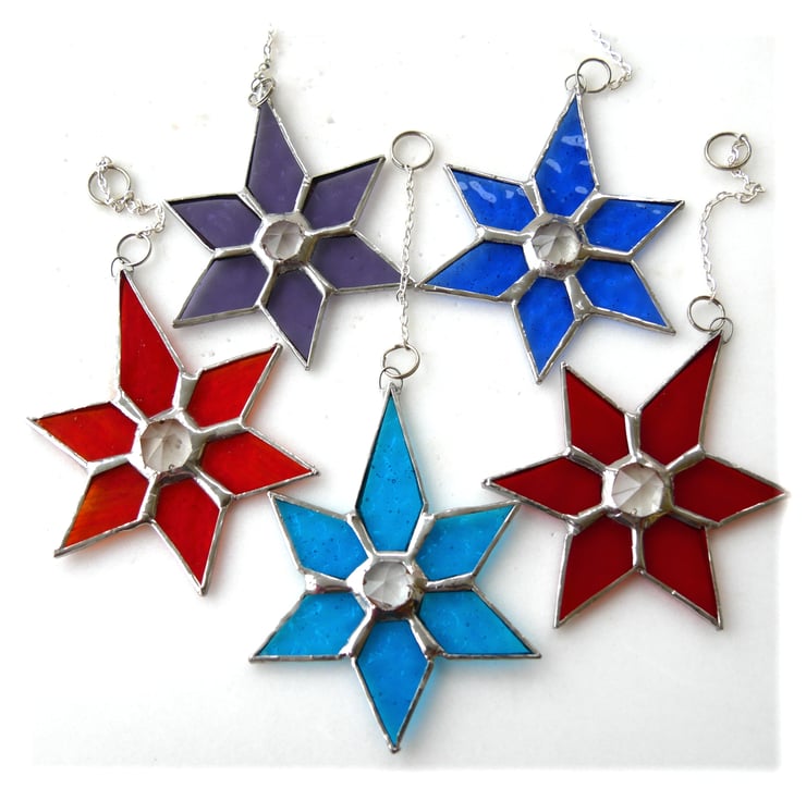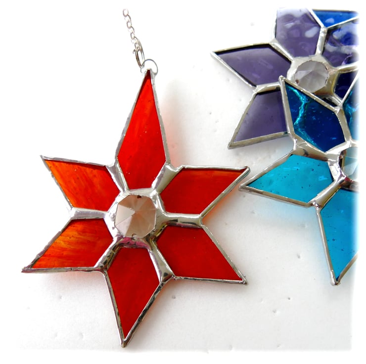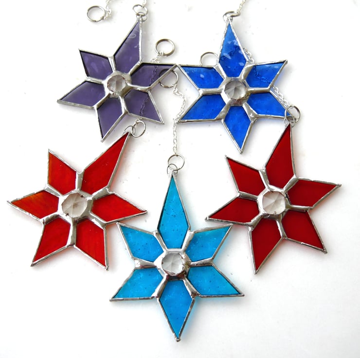 The stars are 11cm x 9cm and hang from a silvery chain attached via a soldered wire ring to the top of the star. I supply it with a suction pad so you can hang it in the window.