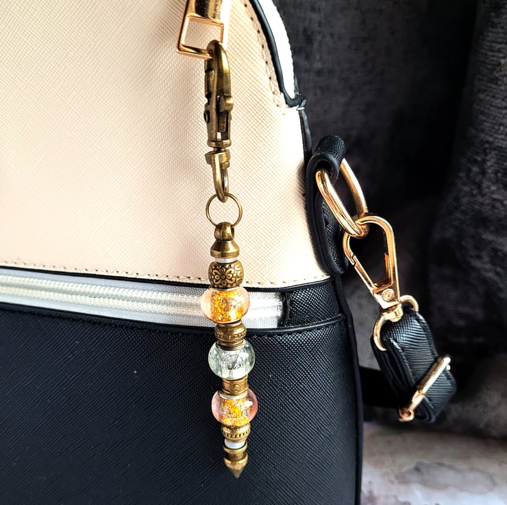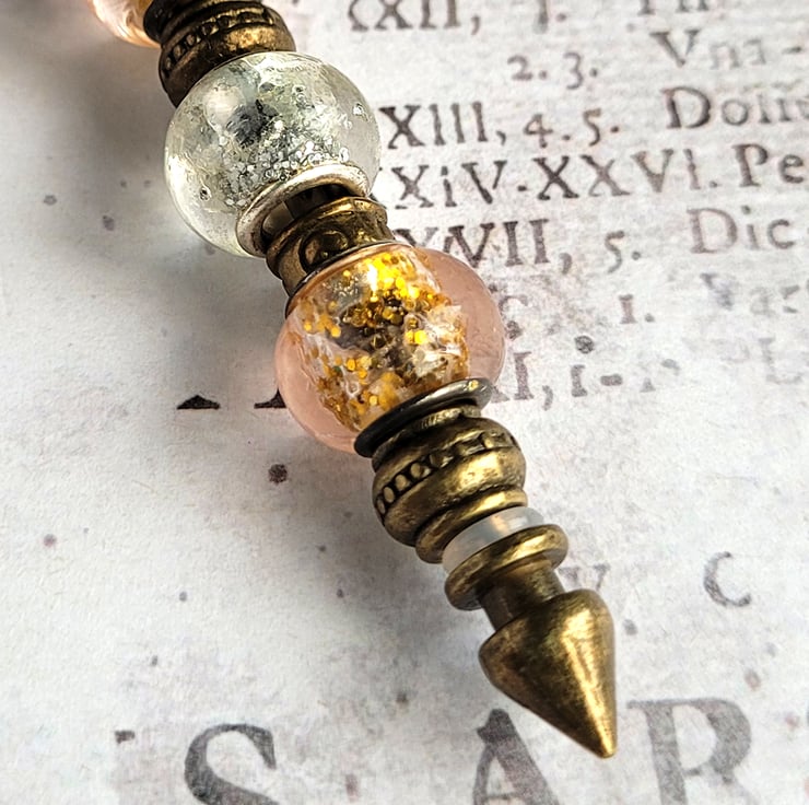 Handmade with love, this calming "fidget" bag charm is designed to ease anxiety and encourage mindfulness. The antique bronze spear carries large crackle glass beads in colours of topaz and clear, separated by a variety of bronze spacer barrels, all of which rotate satisfyingly between your fingers.