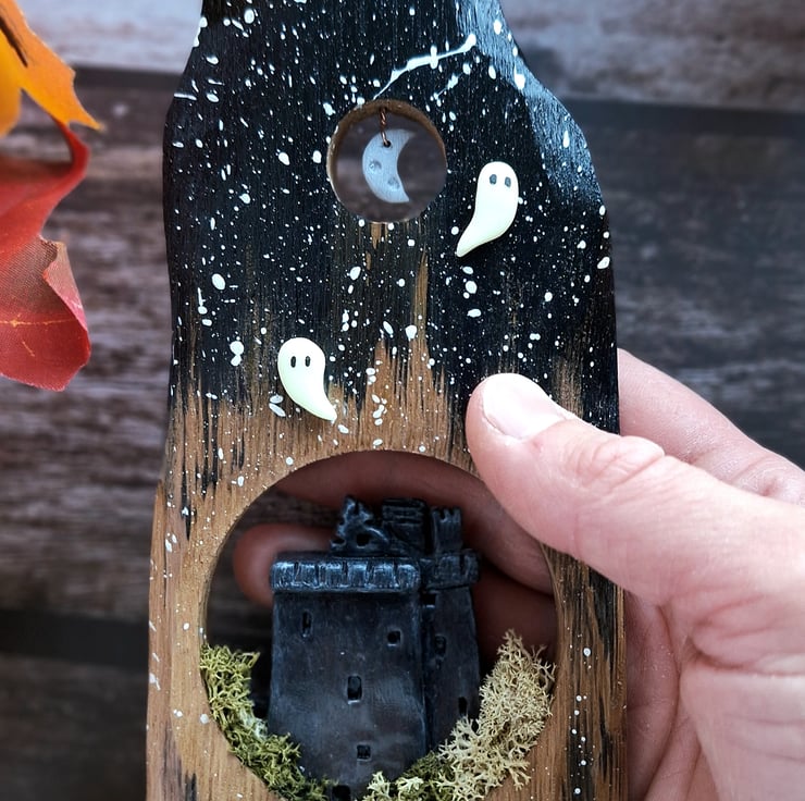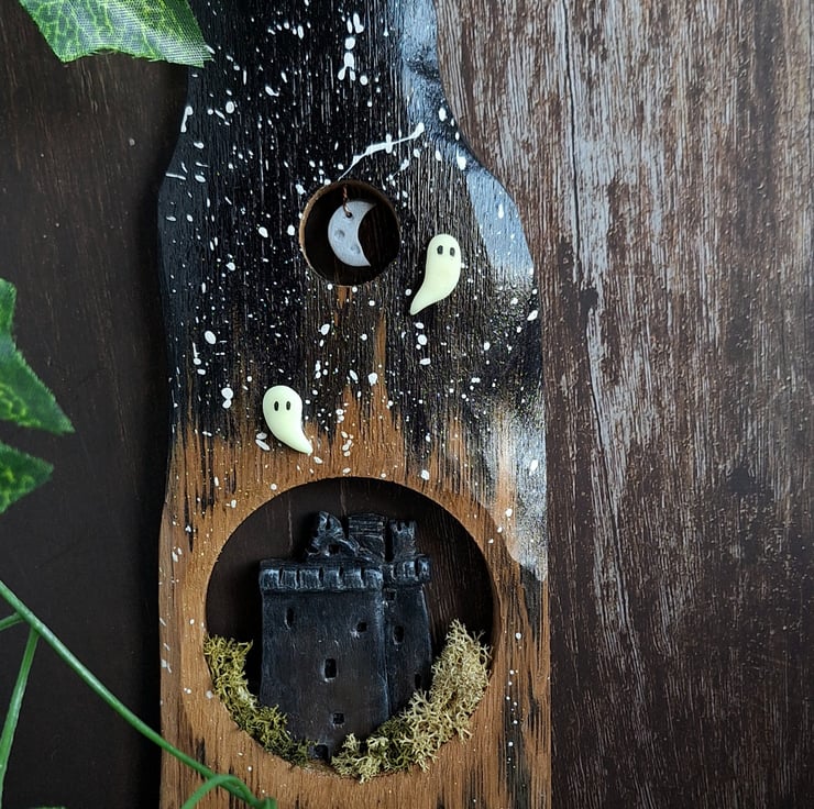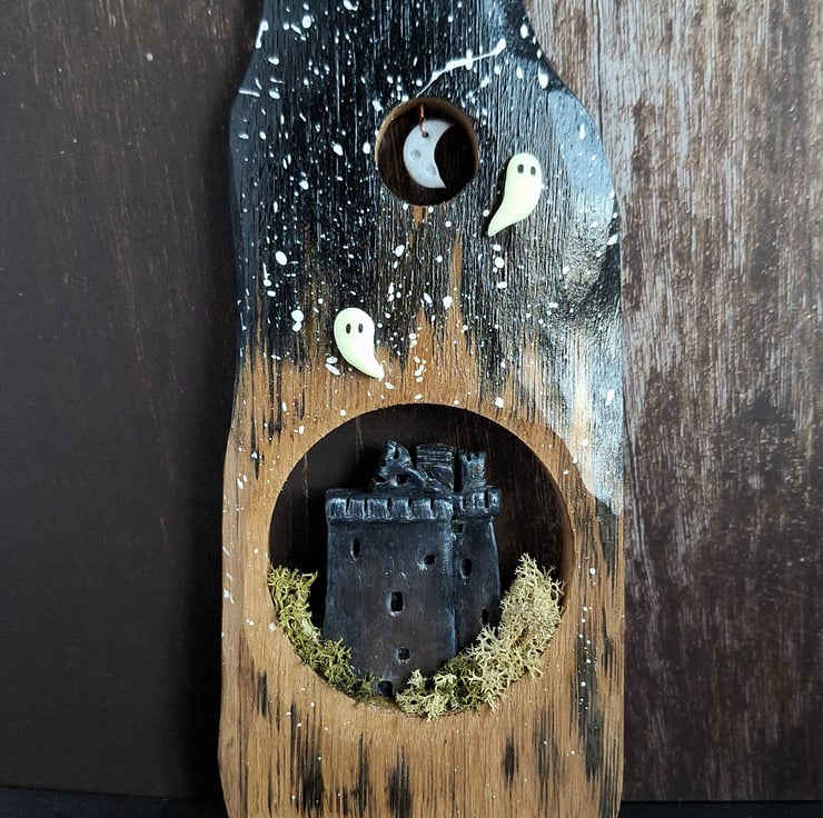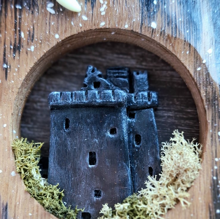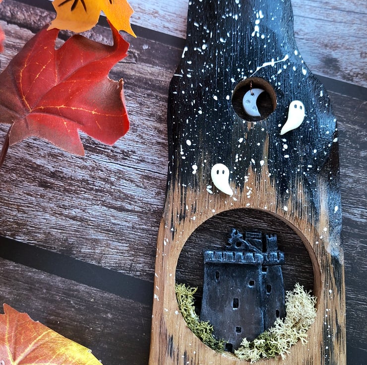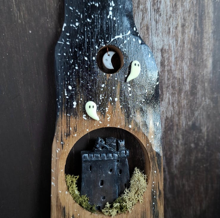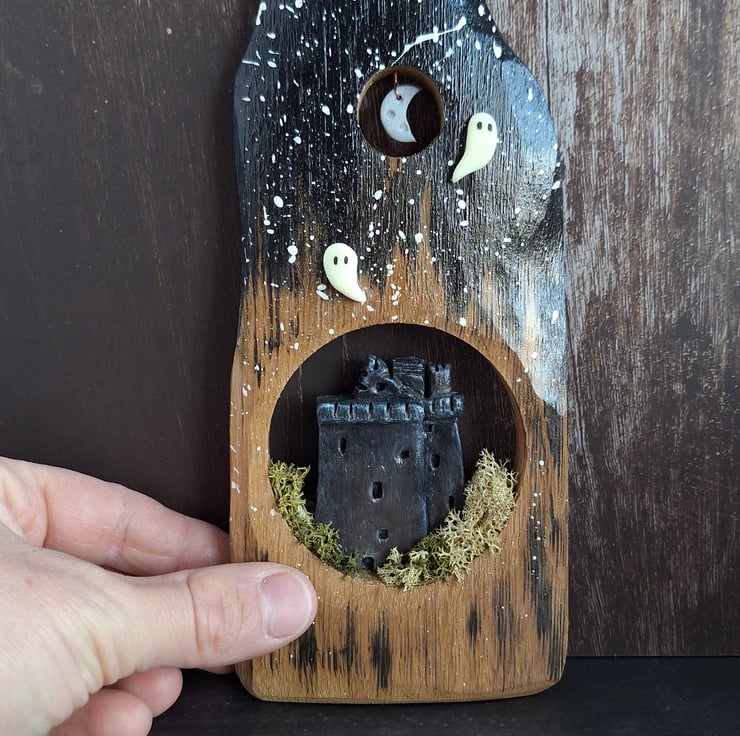 This one off piece is made froma unique section of reclaimed oak whisky stave. The stave has been sanded to remove imperfections, which left this unusual shape. So to complement this, I decided to create a spooky Castle to sit in its centre! Tha castle is sculpted from polymer clay, then handpainted and varnished.