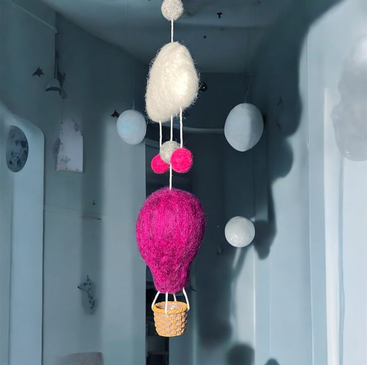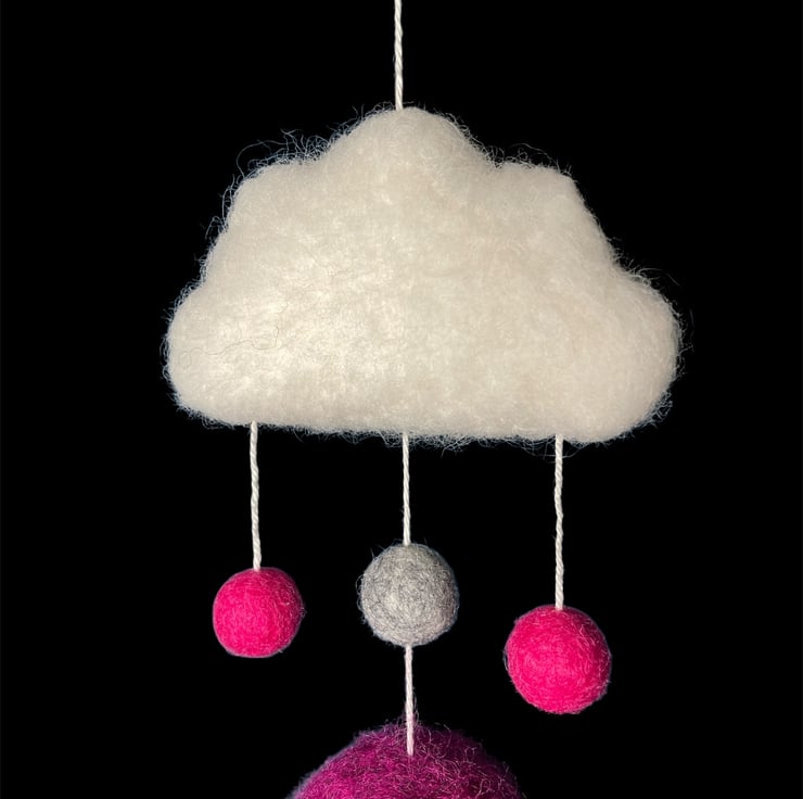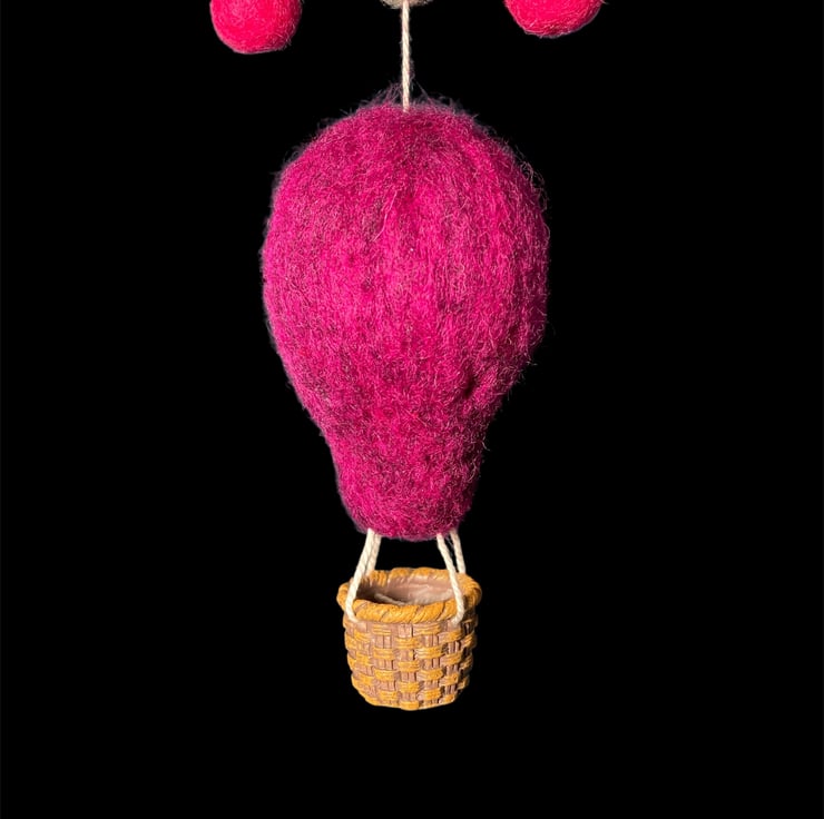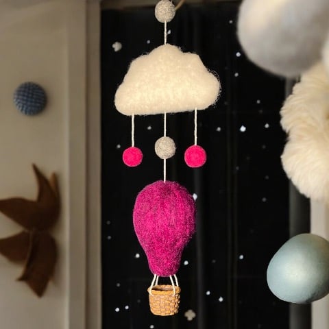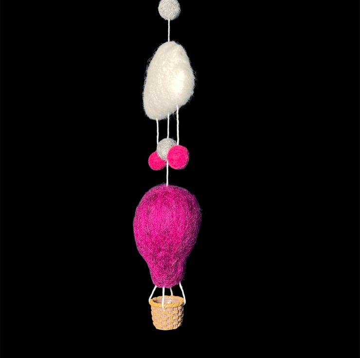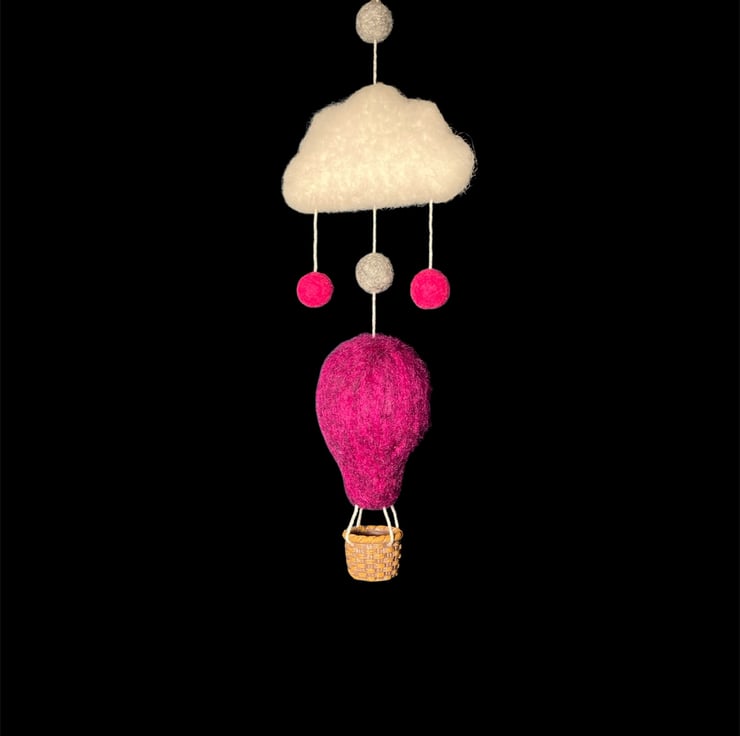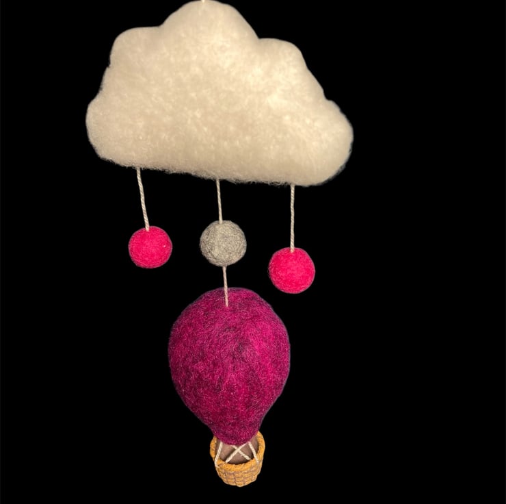 A single hot air balloon flying under a cloud. This nursery decoration has been needle felted using Corriedale woollen fibres and features a fluffy white cloud, colourful pink and grey felt balls, and a vibrant dark pink/purple hot air balloon with a tiny woven effect basket. A small brass hoop added to the top facilitates hanging of the decoration. Perfect for a nursery, children's room or as a home accent. This decoration could be hung either as a wall decoration or from the ceiling as a mobile allowing it to spin in the breeze. A lovely gift for a new baby or baby shower.