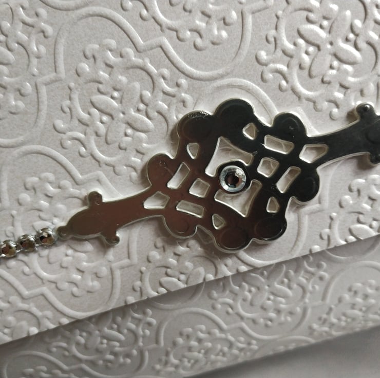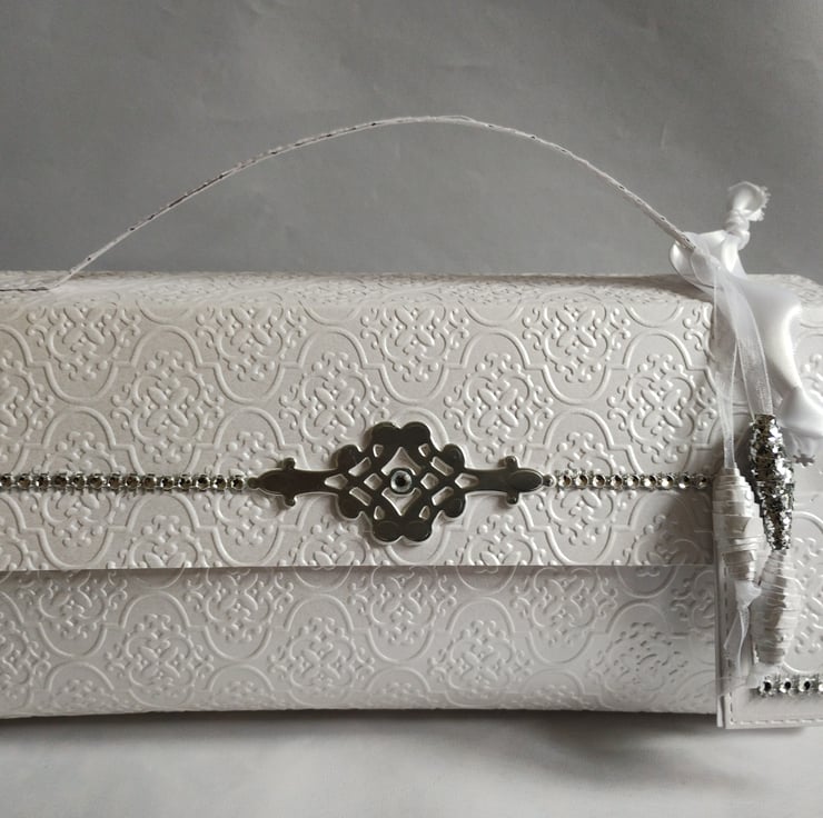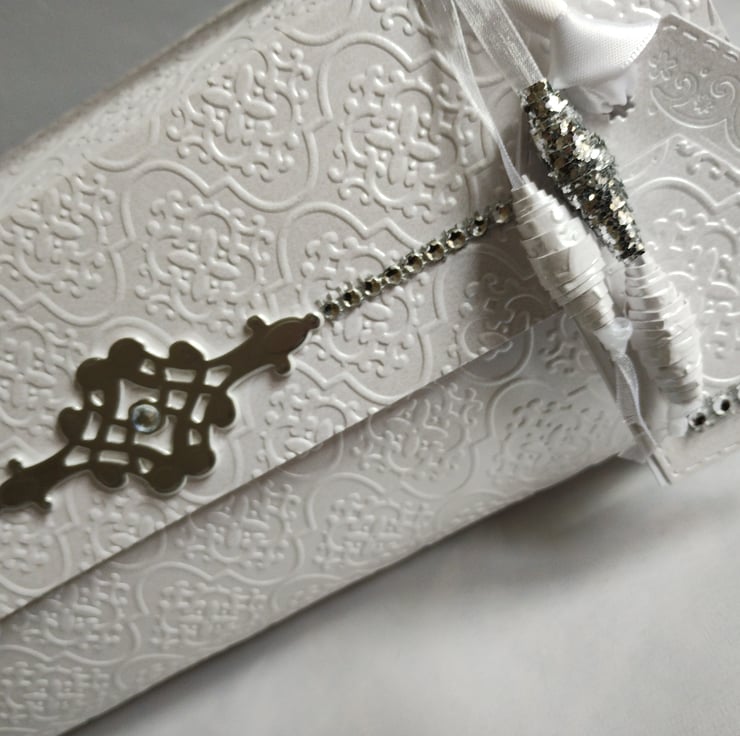 This is an absolutely stunningly gorgeous white pearl finish with silver accents portmanteau style gift box. Its is a unique design and perfect for weddings, anniversaries or any occasion which demands something special. Made with premium quality white pearl finish double sided cardstock which is embossed with a tapestry pattern to front, back and front flap to give detailed dimension and emphasise the beautiful pearl finish. Decorated with a muted silver filigree cardstock accent there is a line of diamante gems along the front flap adding to the luxurious appearance of the gift box. The matching paper beads are tied with sparkling white organza ribbon and the co-ordinating tags, for you to write your message, are tied with gorgeous white wide satin ribbon. If ordering between November and December this will also include silver snowflake dangles which are on a ribbon loop and can be easily removed.