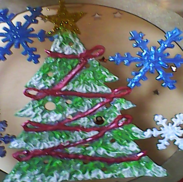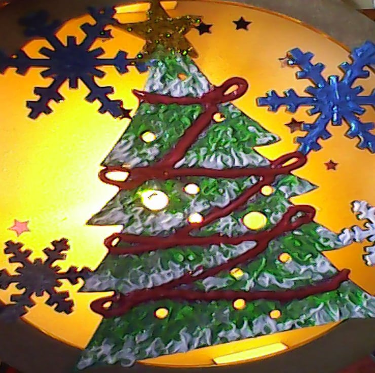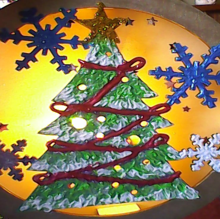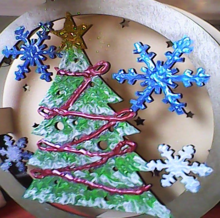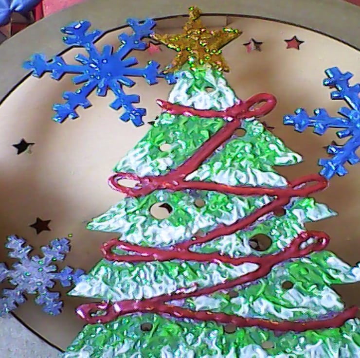 IS HANDPAINTED WITH METALLIC AND 3D ACRYLIC PAINT, CHRISTMAS TREE AND SNOWFLAKES.