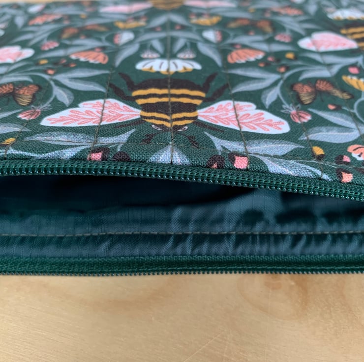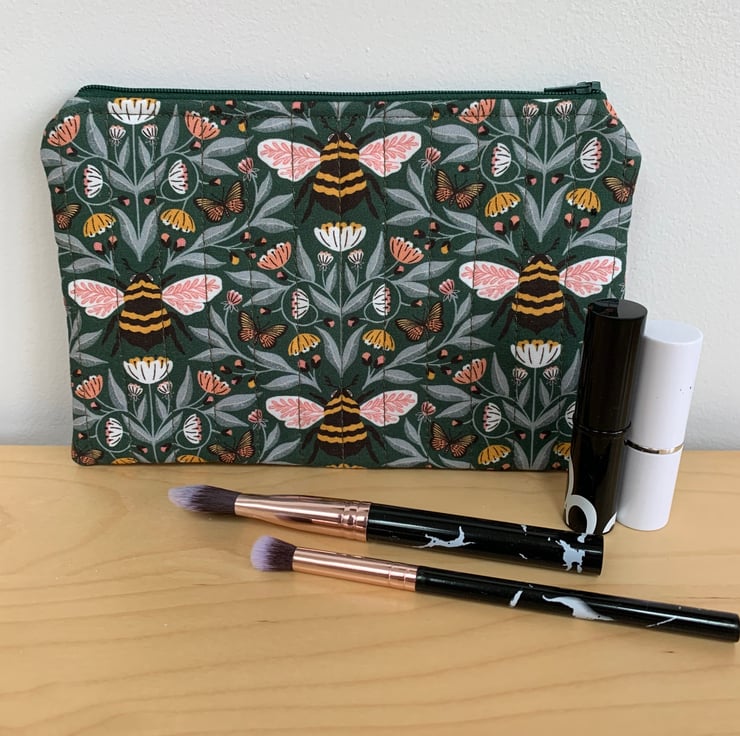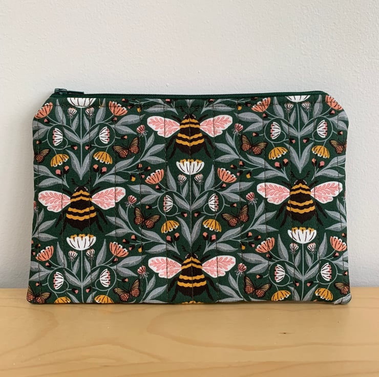 The pouch features this stunning bee print on a dark green background, and is quilted with dark green stitching.