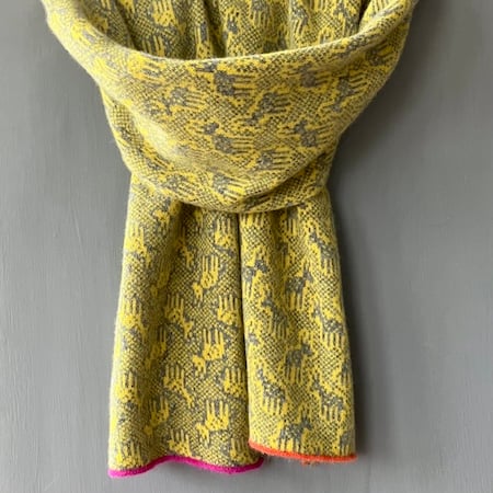 This is a two-colour hand-crafted merino lambswool scarf with a special donkey design, in piccalilli and mid grey, with magenta and orange trim on the ends.
