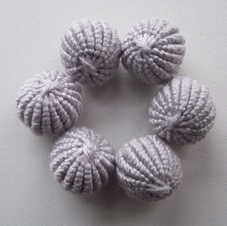 This listing is for a set of six spherical light grey buttons, which have been intricately crafted using cotton thread. They are stuffed with safe polyester stuffing. They have integral shanks for ease of attaching to clothes, bags etc. As well as being used as functional buttons, they could be used as embellishments. Ideal for re-enactors.
