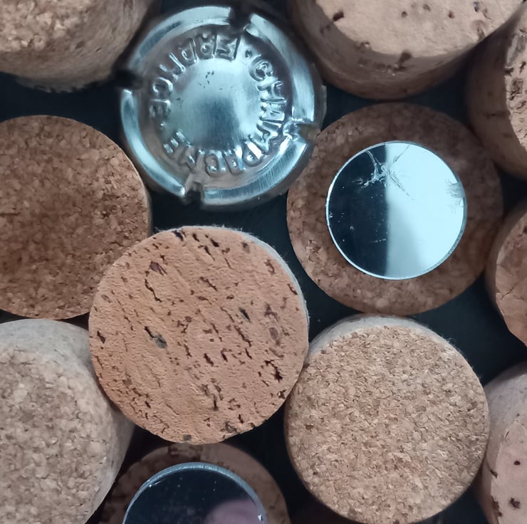 I have arranged champagne corks and metal bottle tops with small mirrors in a pre-loved frame.
