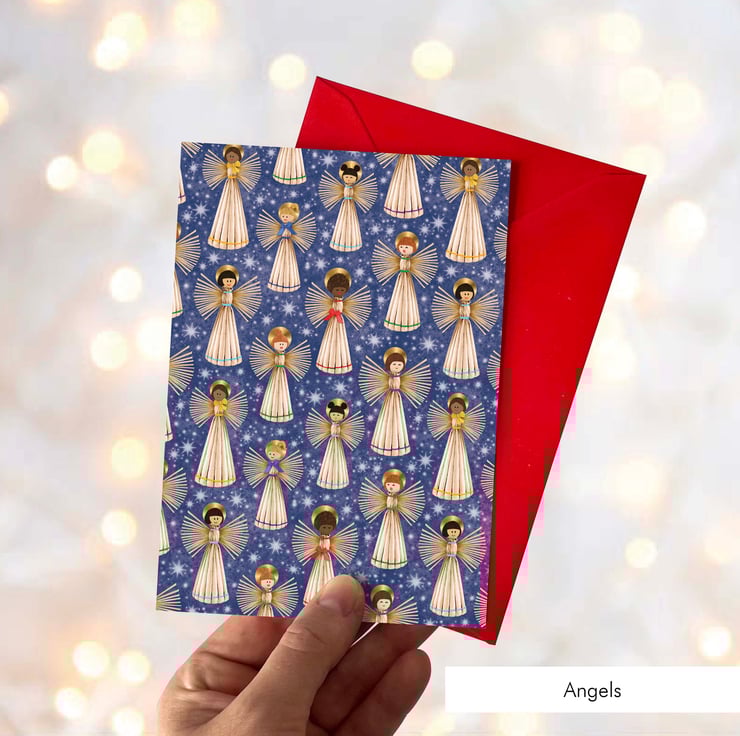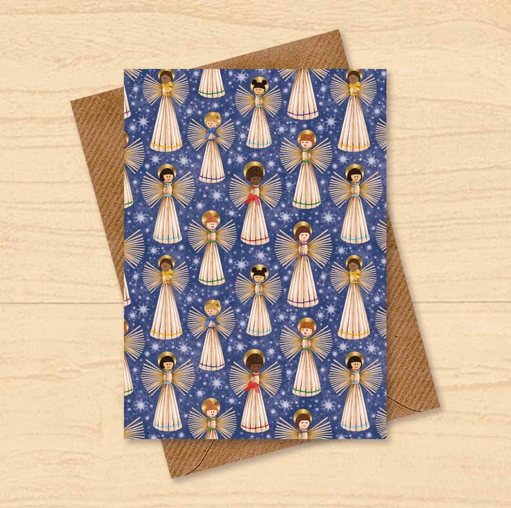 Celebrate the season with this colourful, hand-drawn Straw Angel card, inspired by Scandinavian folk traditions. Set against a softly glowing, starry sky, a joyful group of diverse straw angels brings warmth, charm, and a fresh, inclusive twist to festive greetings.