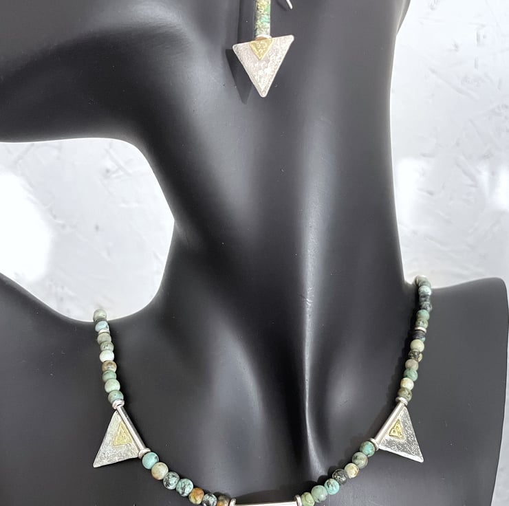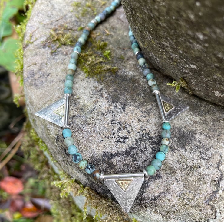 African turquoise necklace with silver and 18ct gold triangle beads