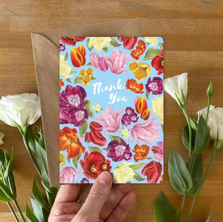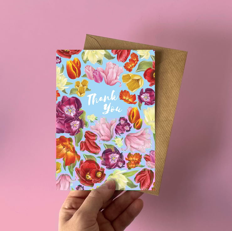 Say thank you with colour and charm! This vibrant greetings card features hand-drawn tulips in bold shades of purple, pink, red and orange – perfect for expressing gratitude in a joyful, heartfelt way.