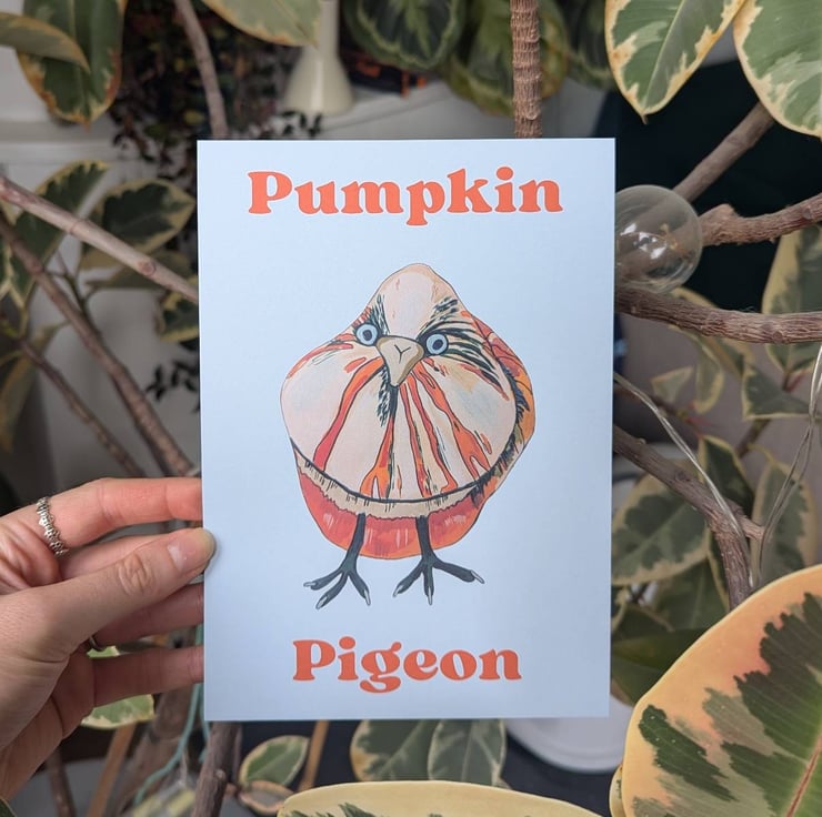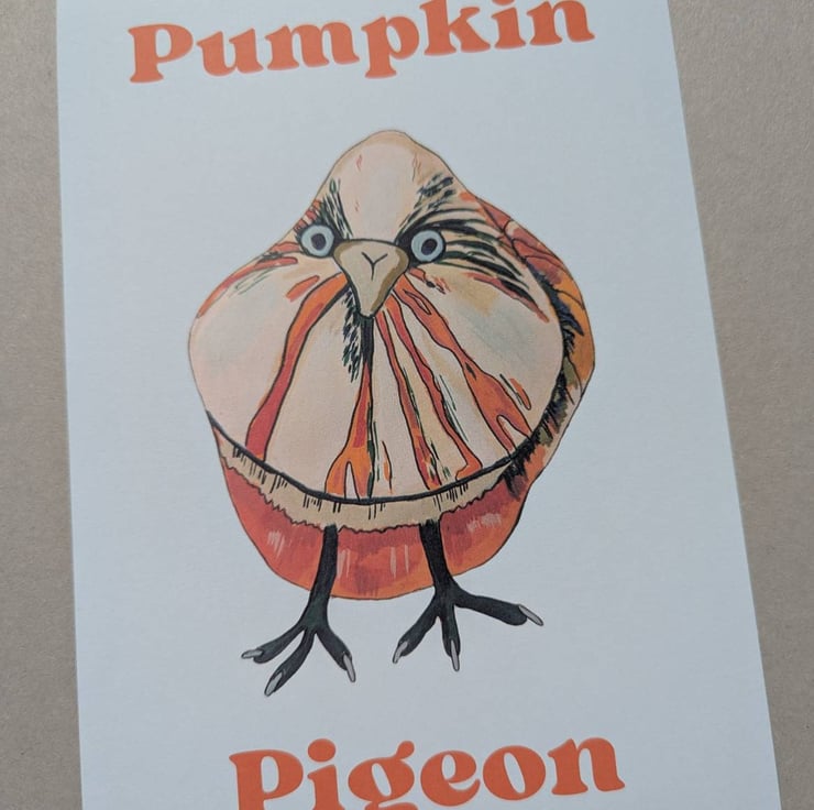 Bring some fun to your space with a high quality digital inkjet print. This colourful print would make a fabulous fun gift for someone special in your life, a pumpkin or pigeon lover! Or as a little treat for your own home.