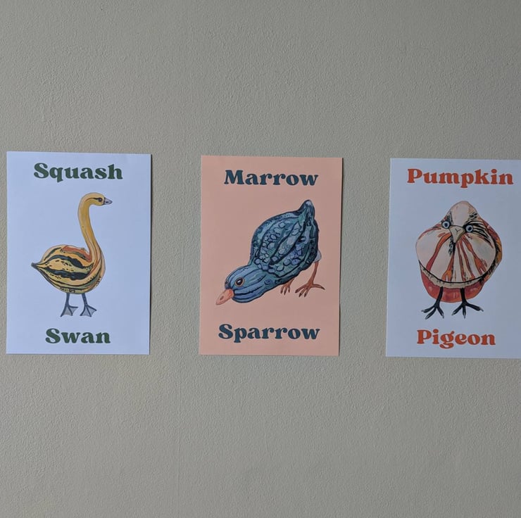 Inspired by oddly shaped vegetables, the 'squash bird' print series celebrates all things quirky. All designs were originally hand-painted in gouache, before being incorporated into a digital design with text.