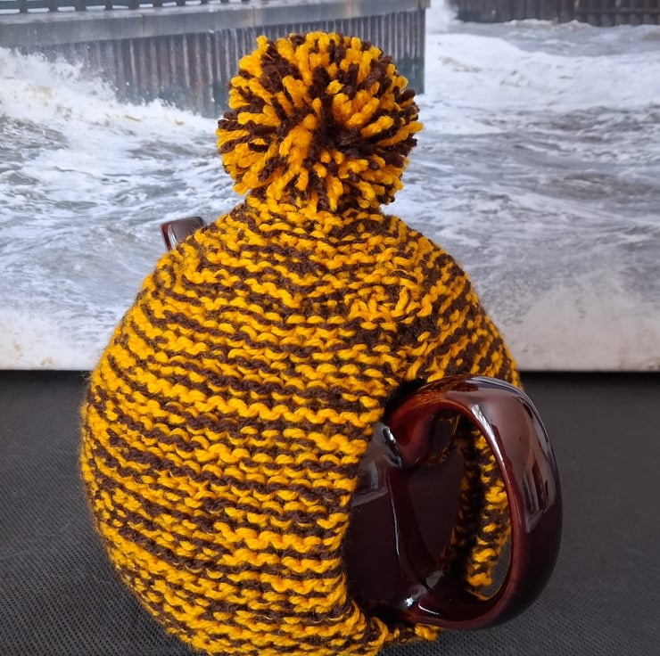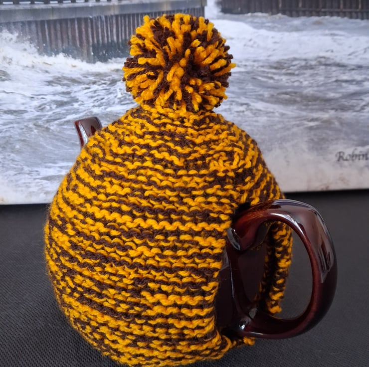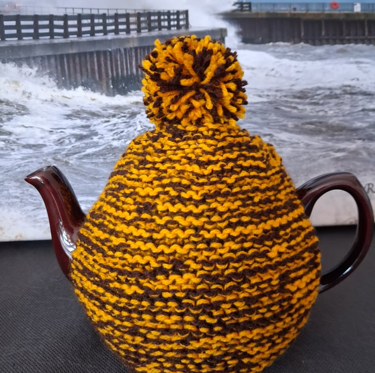 This is a three to four cup hand knitted tea cosy. I have used two strands of yarn yellow and brown which makes the cosy nice and thick. The colours remind me of the sweets banana and chocolate chews. Please note teapot not included.