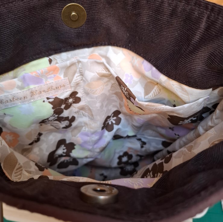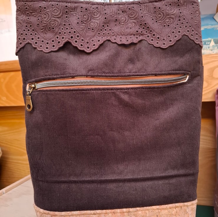 Smart crossbody bag in soft brown needlecord and cork fabric with broderie anglaise trim. Zipped front pocket and two patch pockets on the reverse. Lined in cotton print, with inside pockets, magnetic fastener and adjustable cotton webbing straps.