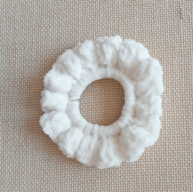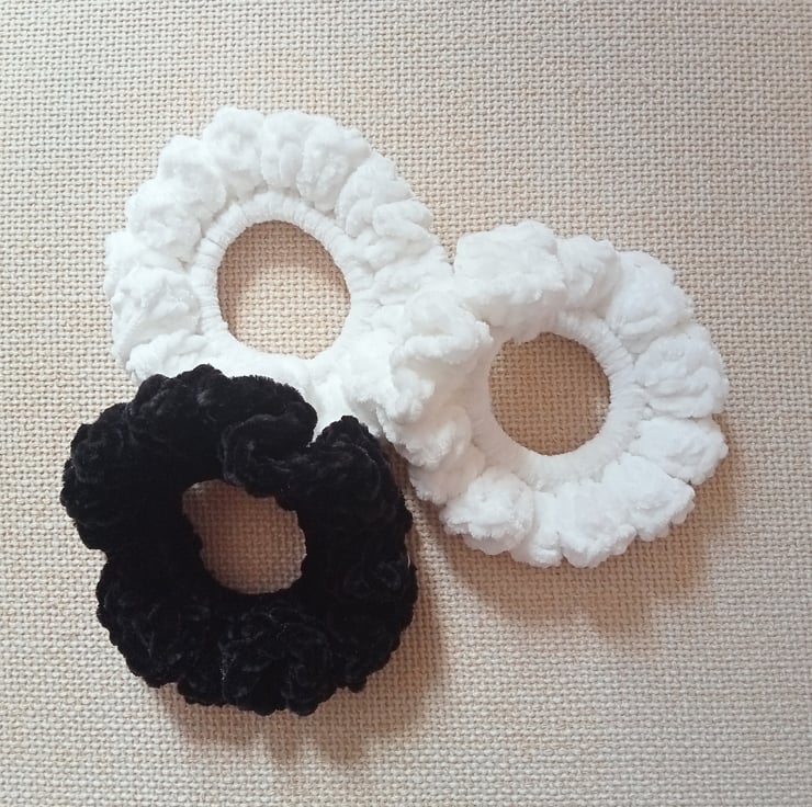 This crochet PATTERN is for a scrunchie. To fit: adult. The scrunchie is crochet in double knitting velvet yarn using a 5 mm crochet hook. One ball of yarn will make about 10 scrunchies. You will also need an elastic hair bobble.