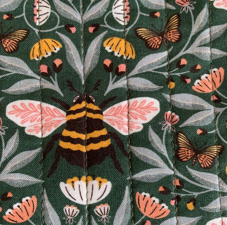 It is made in this striking bee print on a dark green background.