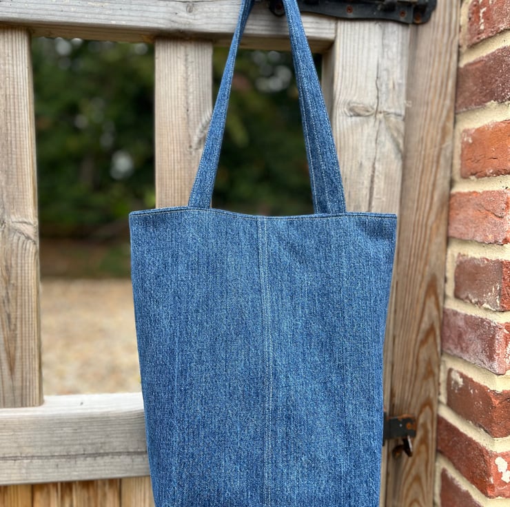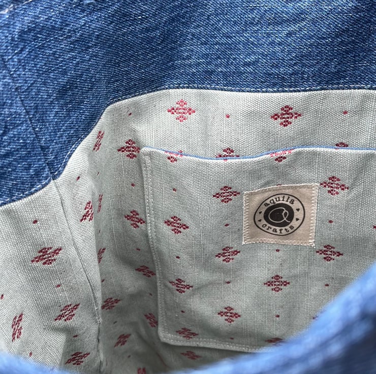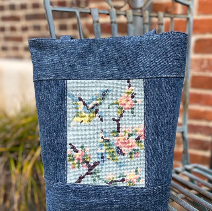The wool tapestry has been edged with reclaimed denim from a pair of jeans and the bag is lined with pale blue-grey and pink upholstery fabric. A layer of interfacing gives the bag structure.