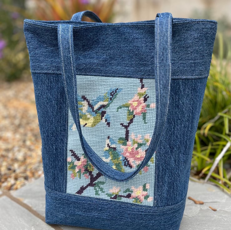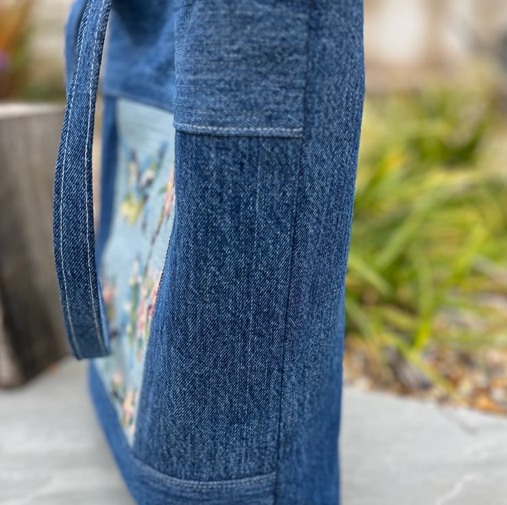 One of a kind tote bag made from a pretty tapestry panel with blue tits and cherry blossom combined with denim from old jeans.