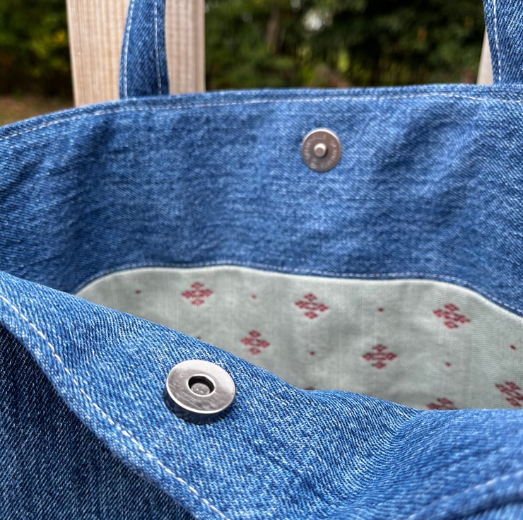 Denim straps are long enough to wear on your shoulder if you want to. There is a small patch pocket inside. The bag fastens with a magnetic snap.