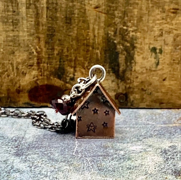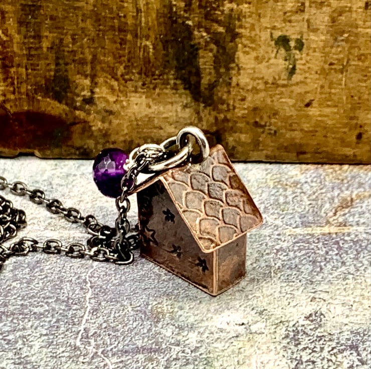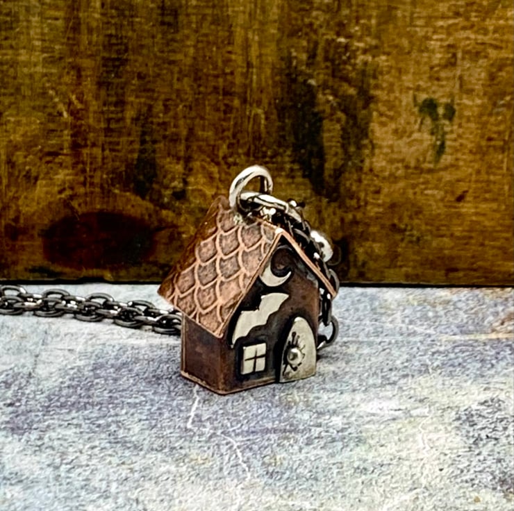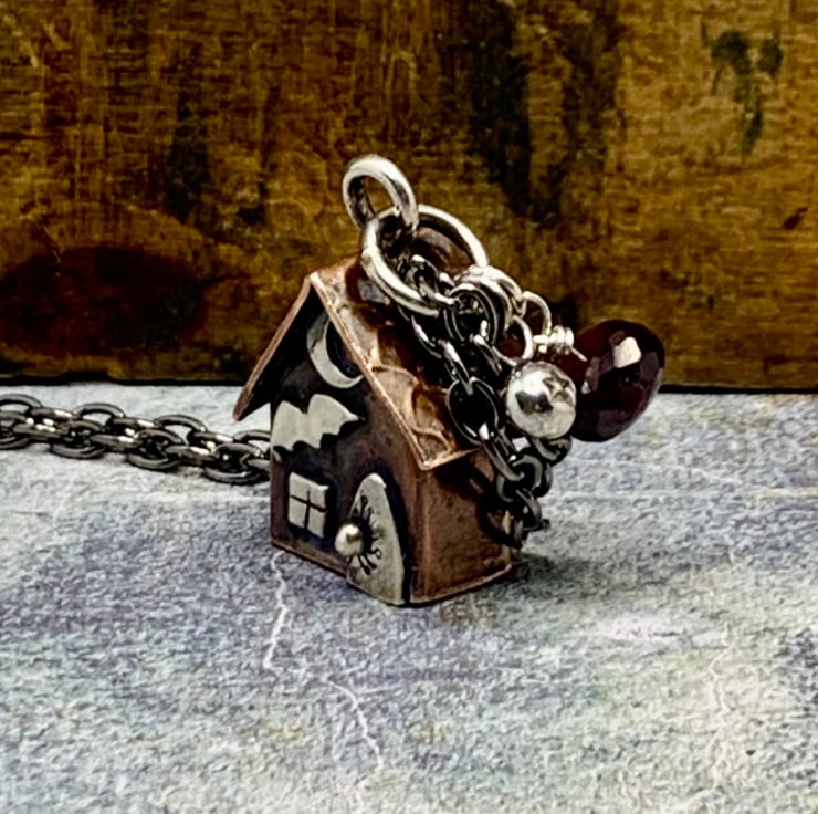 This handcrafted Bat House Pendant is made from sheet copper, shaped into a tiny house using traditional metalsmithing techniques. The design features a silver bat, door, and moon, giving it a magical, nocturnal vibe.