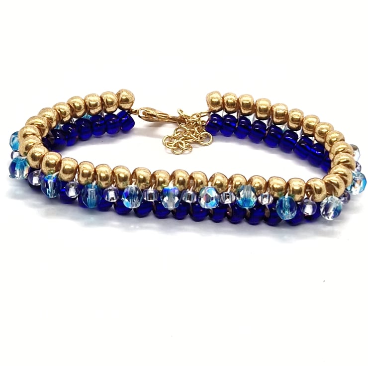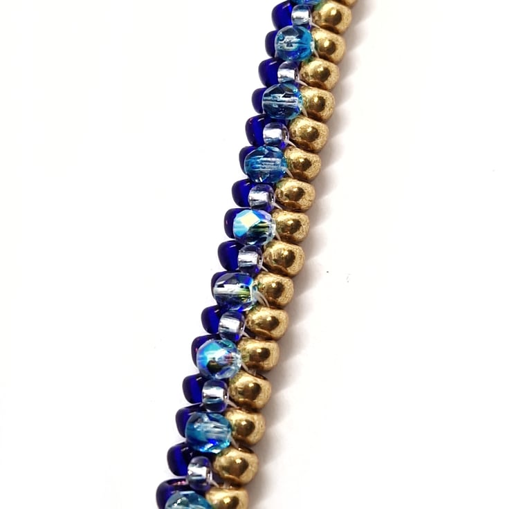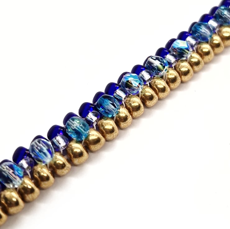 This gold, royal-blue and shimmering blue tennis-style beaded bracelet has been carefully and lovingly handcrafted using bold and shiny gold seed beads, shiny royal blue seed beads, silver seed beads and shimmering silver and turquoise faceted beads.