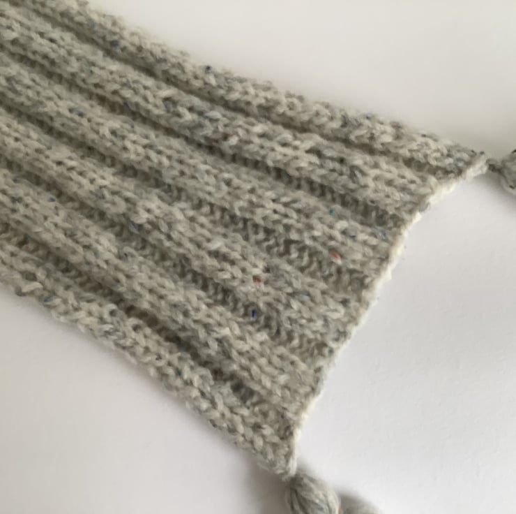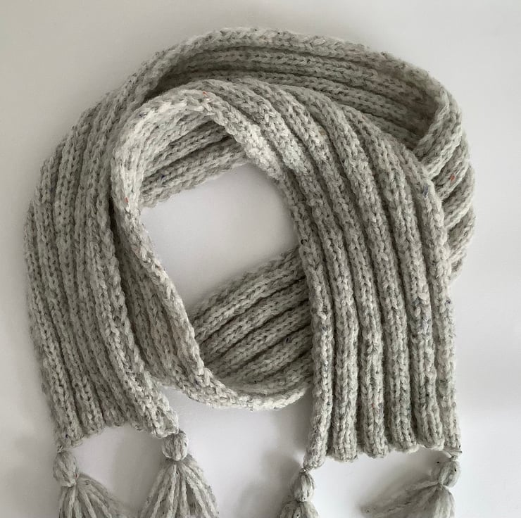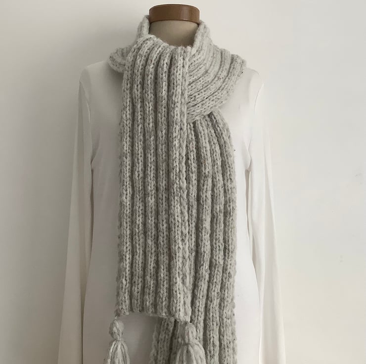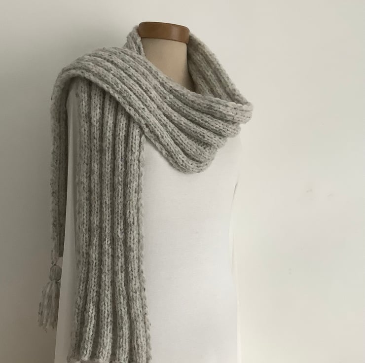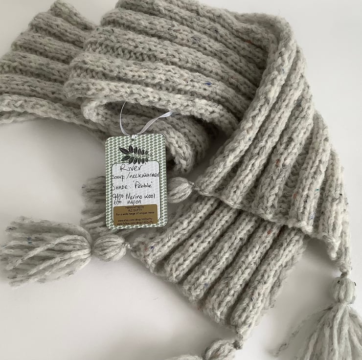 I have designed and knitted this scarf ' River' in a beautifully lightweight , soft Merino wool yarn. A nice length than can be worn in various ways - wrap it once or twice . I've also added tassels to each corner for added interest. Very light and airy , yet warm and oh-so cosy .