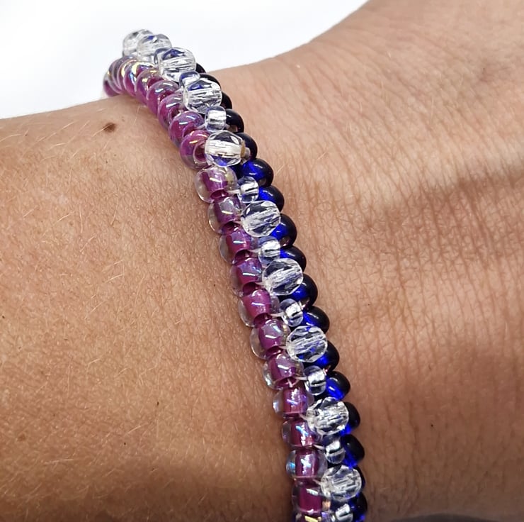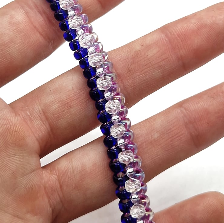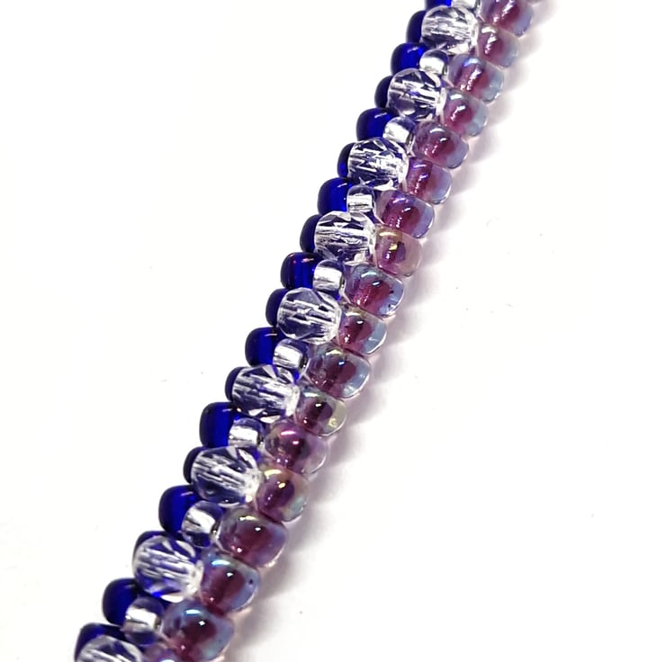 This pink, royal blue and silver tennis-style beaded bracelet tennis-style beaded bracelet has been carefully and lovingly handcrafted using sweet and shimmering pink seed beads, shiny royal blue seed beads, silver seed beads and shimmering crystal clear faceted beads.